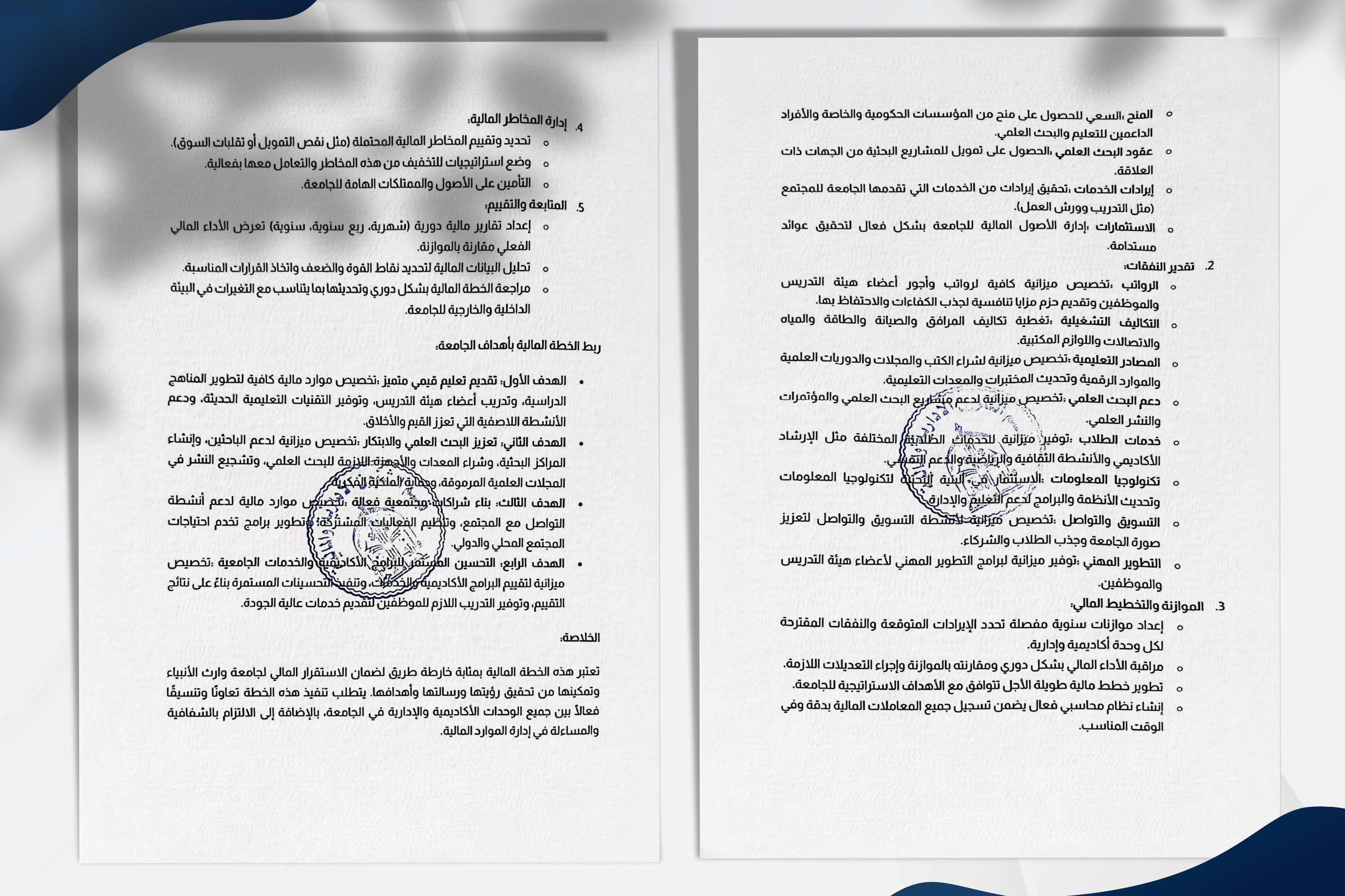 وتنسجم هذه الخطة مع أهداف التنمية المستدامة، خصوصًا الهدف الرابع (التعليم الجيد) والهدف الثامن (العمل اللائق ونمو الاقتصاد)، من خلال بناء منظومة مالية متينة تدعم التعليم والبحث العلمي وخدمة المجتمع.