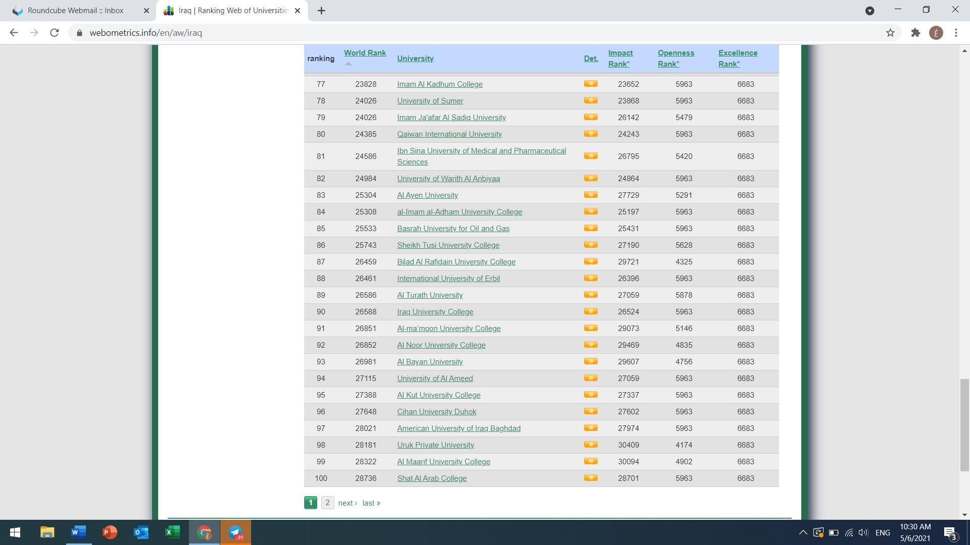 2. دخلت جامعتنا العزيزة بتصنيف webometrics Rankings الاسباني , و حصلت على المرتبة 82 محليل و 24984 عالميا حيث بدا هذا التصنيف سنة 2004 حيث صنف 16000 جامعة , حيث يهدف بالدرجة الاولى الى حث الجهات الاكاديمية في العالم لتقديم ما لديها من انشطة علمية تعكس مستواها العلمي المتميز.