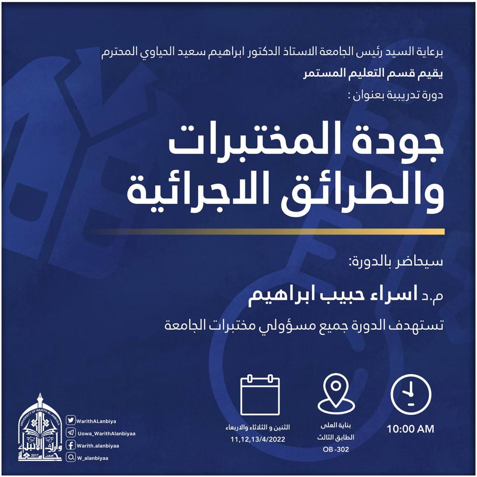 برعاية رئيس جامعة وارث الأنبياء (عليه السلام) الاستاذ الدكتور ابراهيم الحياوي أقام قسم التعليم المستمر في الجامعة دورة تدريبية بعنوان " جودة المختبرات والطرائق الاجرائية " حاضر فيها