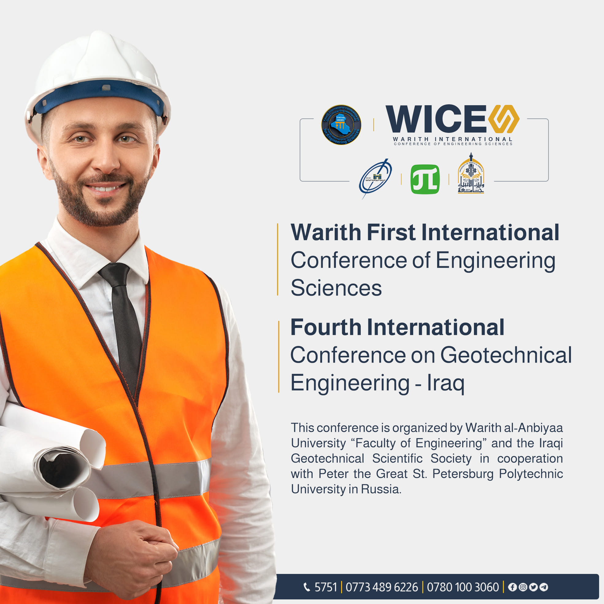 تدعو كلية الهندسة في جامعة وارث الأنبياء (عليه السلام) الأكاديميين، والباحثين في الجامعات والمراكز البحثية، والجمعيات العلمية المحلية والدولية للمشاركة في "المؤتمر الدولي الأول للعلوم الهندسية". يُقام المؤتمر بالتعاون مع الجمعية العلمية الجيوتقنية العراقية وجامعة Saint Petersburg Polytechnic في روسيا.