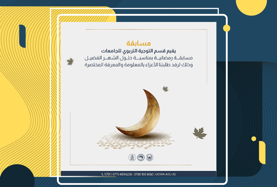 أعلن قسم التوجيه التربوي للجامعات التابع للعتبة الحسينية المقدسة عن إطلاق "مسابقة رمضانية إلكترونية" بمناسبة حلول الشهر الفضيل لطلبة الجامعات.