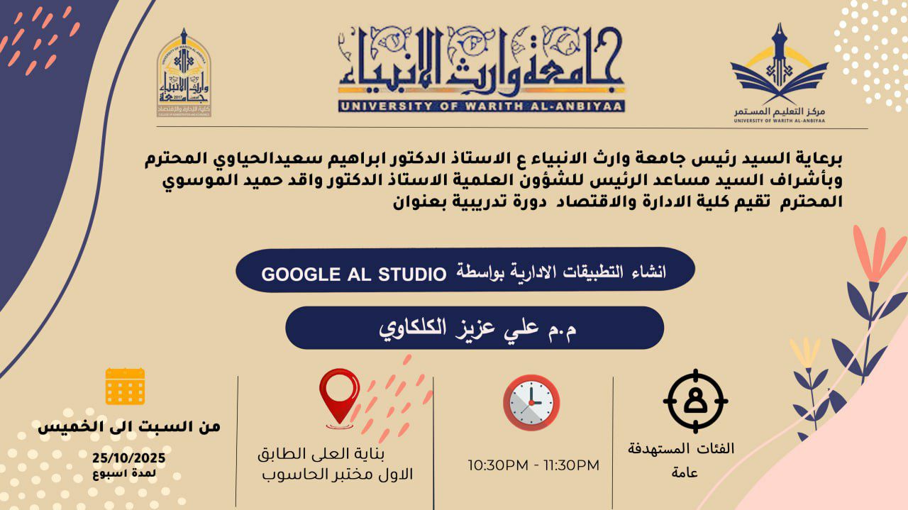 تقيم كلية الادارة والاقتصاد في جامعة وارث الانبياء (ع) دورة بعنوان انشاء التطبيقات الادارية بواسطة Google Al Studio