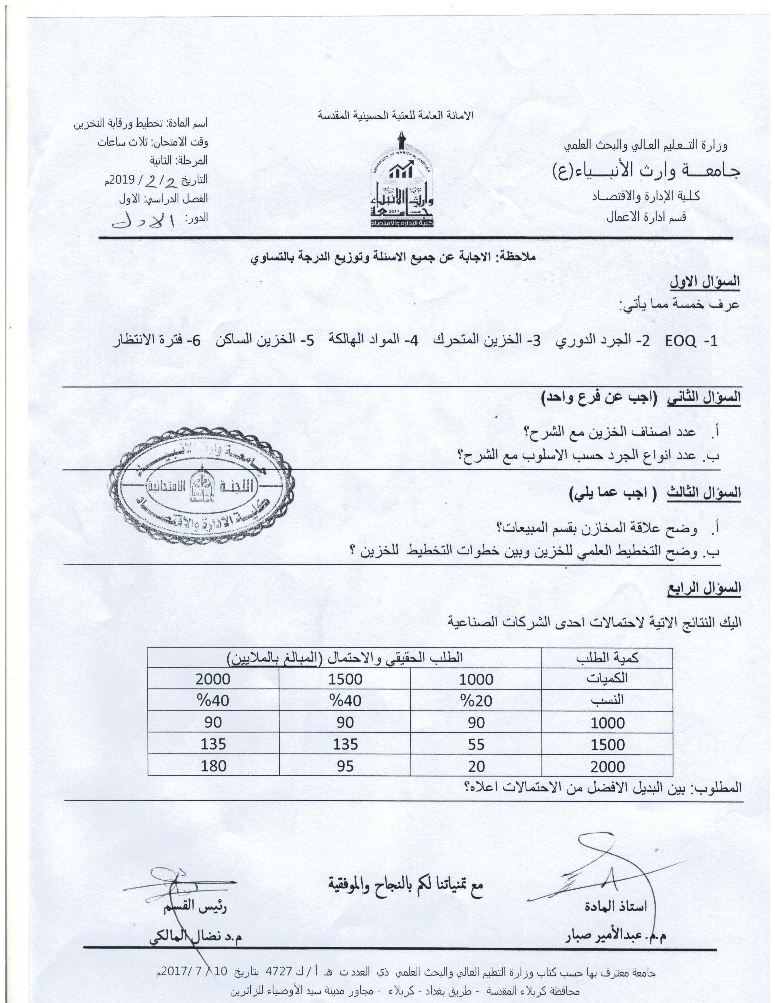 قامة عمادة الكلية ومجلسها الممثل بالاستاذ الدكتور عامر العطوي ود.نضال المالكي ود.فهد الشمري بتكريم الطلبة الاوائل للدراسة الصباحية والمسائية للمرحلتين الاولى والثانية وللقسمين المحاسبة وادارة اعمال في يوم الاحد 3/3/2019 وكذلك تم تكريم افضل طالبة محتشمة لكل قسم وقد حضر مجموعة من السادة التدريسيين والطلبة حفل التكريم
