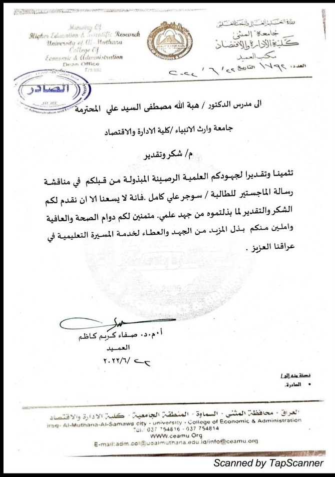 أ.م.د.مشتاق كريم عبد الرحيم / عضواأ.د.عواد كاظم الخالدي / عضوا ومشرفاوبعد مناقشة مستفيضة تم منح شهادة الدكتوراة ..فكل التوفيق والسداد للباحثة والمشرف وللجنة المناقشة