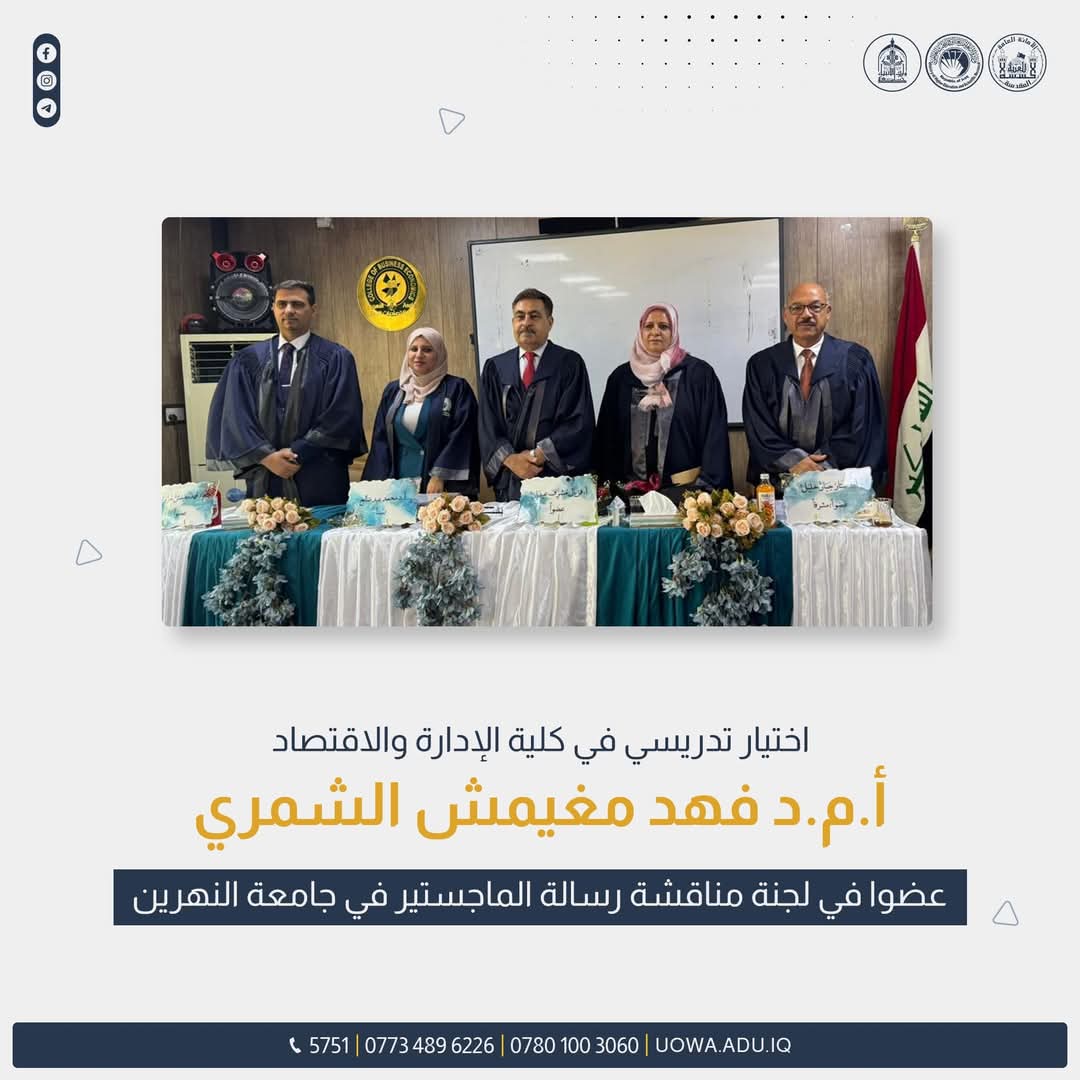 اختير الأستاذ المساعد الدكتور فهد مغيمش الشمري معاون عميد كلية الادارة والاقتصاد عضوا لمناقشة رسالة ماجستير لاحد طلبة الدراسات العليا في جامعة النهرين /كلية اقتصاديات الاعمال/قسم اقتصاديات ادارة المصارف.