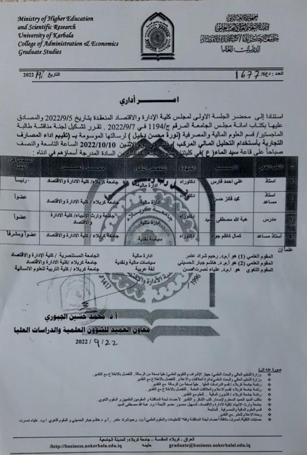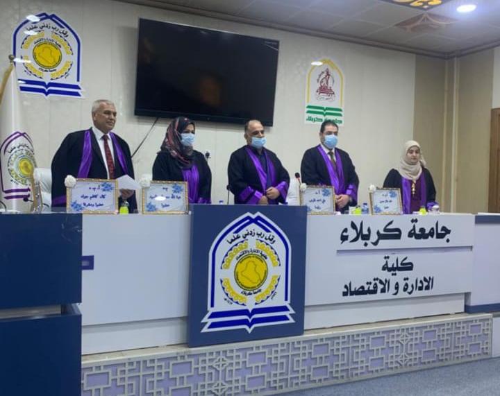 شاركت الدكتورة هبة الله مصطفى رئيس قسم المحاسبة في كلية الإدارة والاقتصاد في مناقشة رسالة الماجستير للطالبة نورة محسن دخيل لرسالتها الموسومة (تقييم اداء المصارف التجارية بإستخدام التحليل المالي المركب) وذلك في يوم الاثنين المصادف ٢٠٢٢/١٠/١٠؛ في جامعة كربلاء كلية الإدارة والاقتصاد قسم العلوم الماليه والمصرفيه.