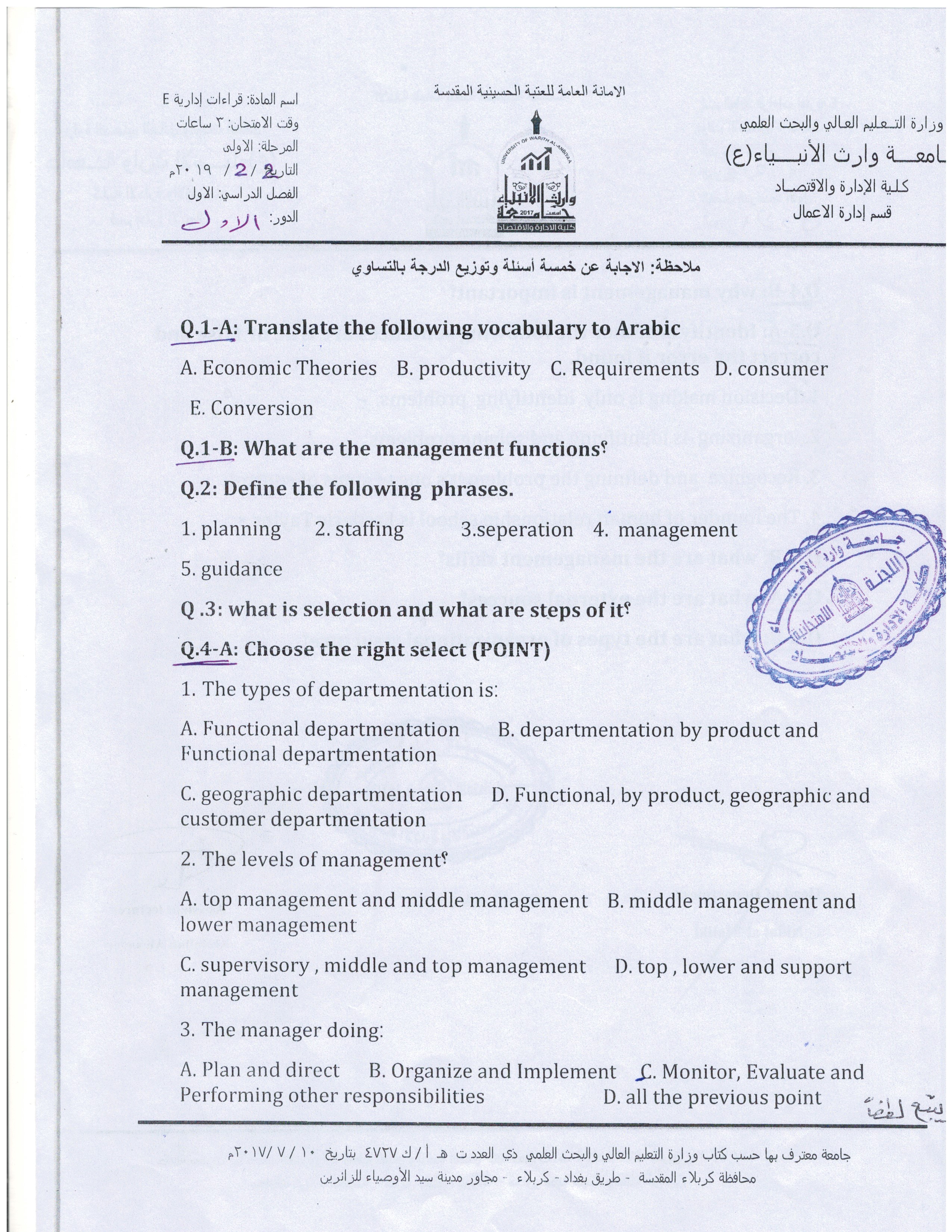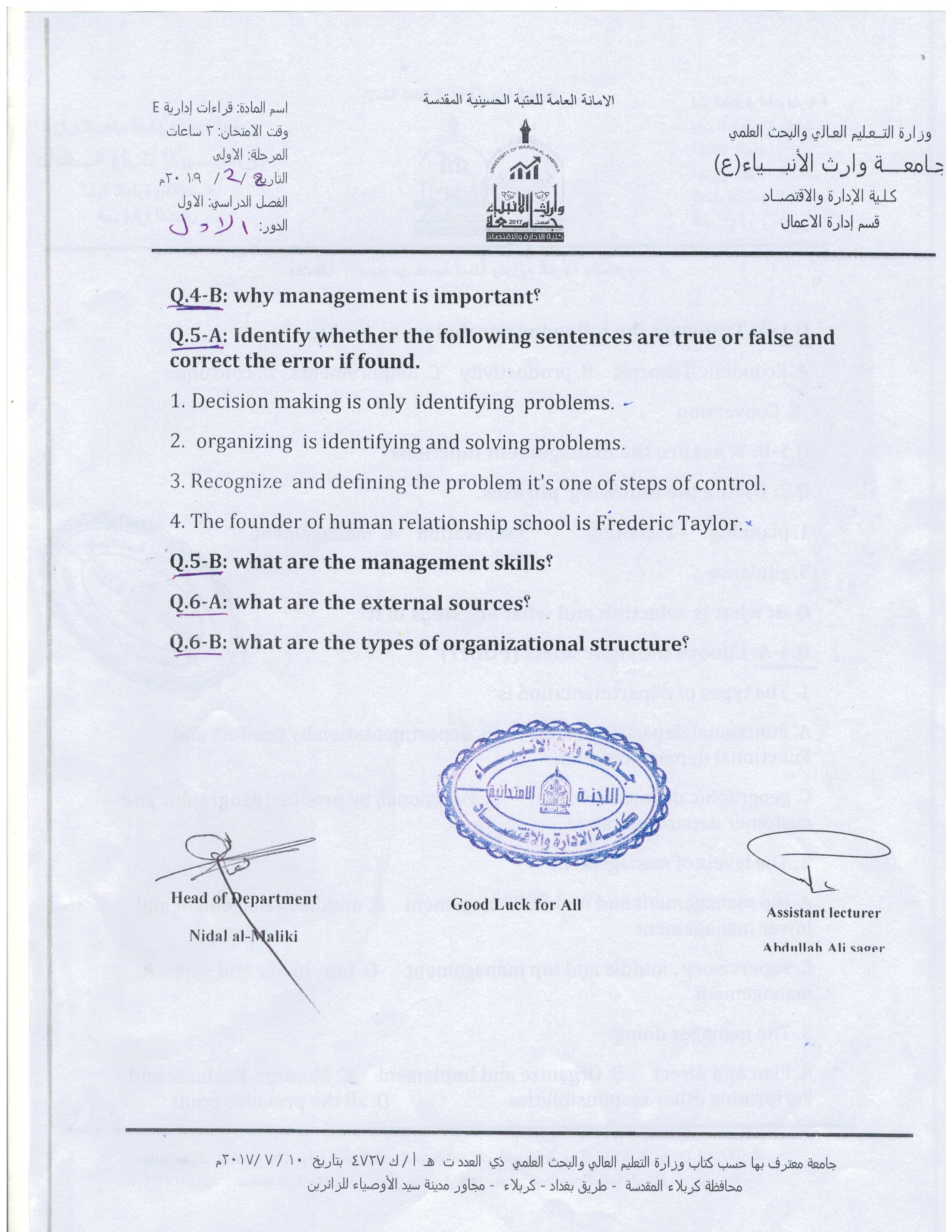 بعض اسئلة الكورس الاول للمرحلة الاولى والثانية ولقسم ادارة الاعمال المجموعة الخامسة