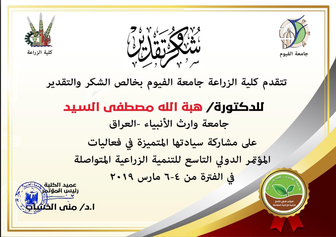 شاركت الدكتورة هبة الله مصطفى السيد علي التدريسية في قسم المحاسبة /كلية الادارة والاقتصاد / جامعة وارث الانبياء في مؤتمر الدولي التاسع للتنمية الزراعية المتواصلة والذي انعقد في جمهورية مصر العربية للمدة من (4-6) اذار /مارس وحصلت الدكتورة هبة الله مصطفى على كتاب شكر وتقدير وشهادة مشاركة من عمادة الكلية / جامعة الفيوم وذلك لمشاركتها المتميزة في القاء بحث بعنوان ((دراسة تطبيقية على عقود الذرة الامريكية باستخدام عقود المستقبليات لتحويط المحاصيل الزراعية))