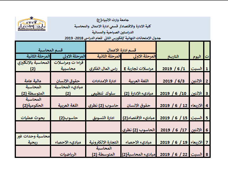 جدول امتحانات نهاية الكورس الثاني لكلية الادارة والاقتصاد