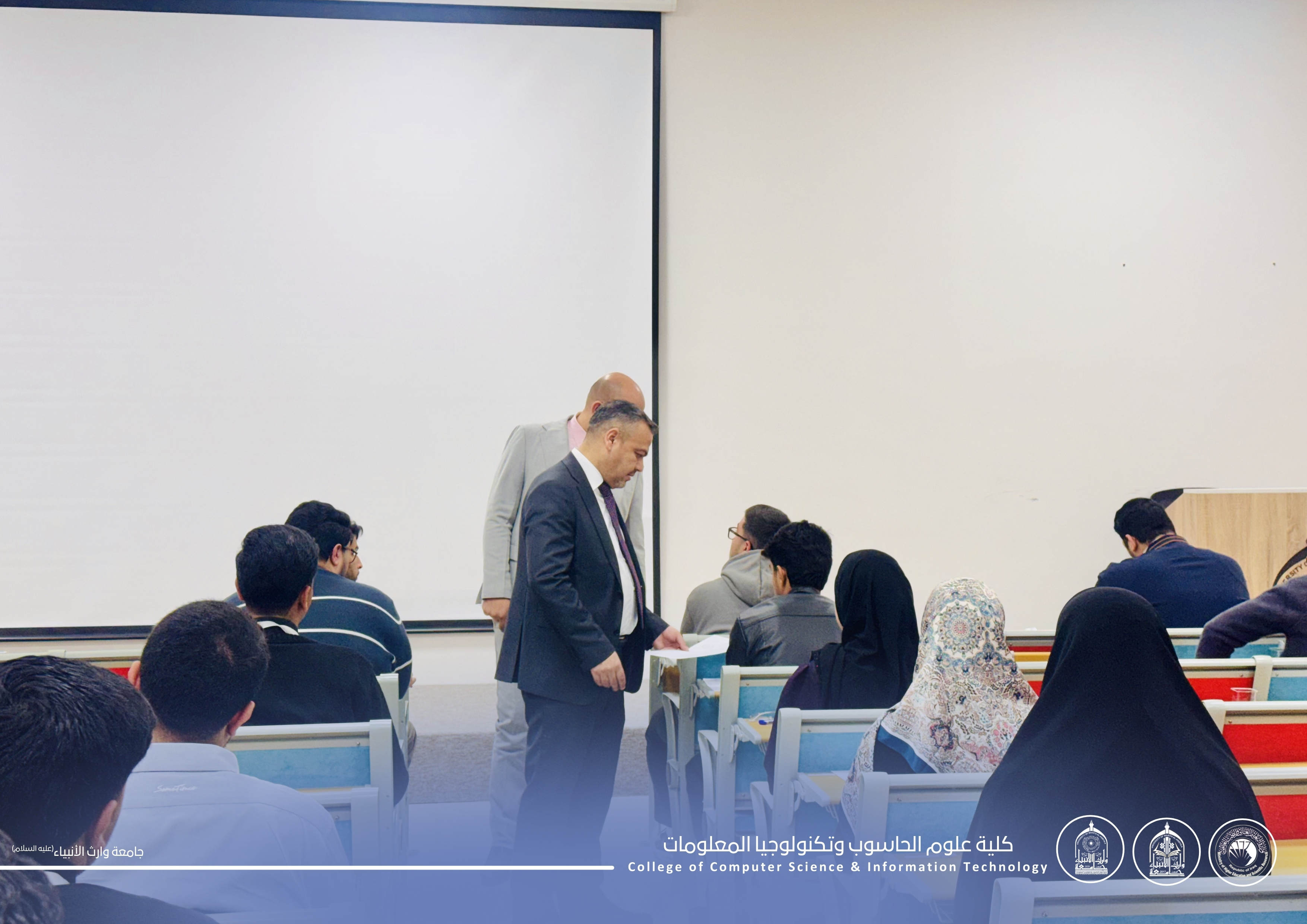 اطّلع مساعد رئيس الجامعة للشؤون العلمية الأستاذ الدكتور واقد الموسوي، يرافقه الأستاذ المساعد الدكتور حيدر محمد علي الغانمي عميد كلية علوم الحاسوب وتكنولوجيا المعلومات، على سير الامتحانات النهائية لطلبة المرحلة الأولى.