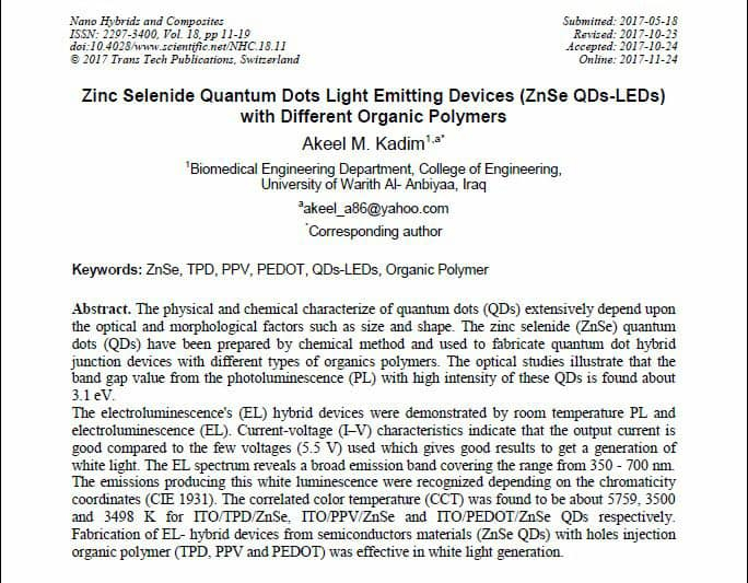 وحسب ما تحدث به الباحث بان البحثيين اختصا في تصميم الاجهزة الباعثة للضوء من مواد نانوية ومركبات عضوية من بوليمرات مختلفة التركيب تسمى ((OLEDs)) والتي تتشكل هندسياً بطريقة كيميائية معينة وتبعث ضوءً ذو ضيائية عالية وبكفاءة ممتازة وبفولتية كهربائية قليلة قد تصل الى (11فولت) واوضح الدكتور عقيل بان اهم التطبيقات لهذا الانجاز العلمي في الحياة العملية هو دخوله في مجال الهندسة الطبية الحيوية حيث يكون عمل هذه الاجهزة ككواشف ملونة بألوان الضوء الباعث منها لكشف الامراض والاورام داخل جسم الكائن الحي وفي العديد من المجالات الهندسية والطبية والابحاث العلمية الاخرى.