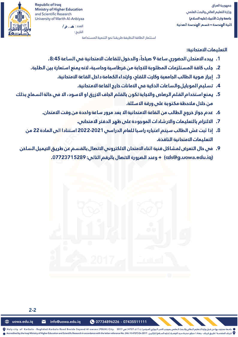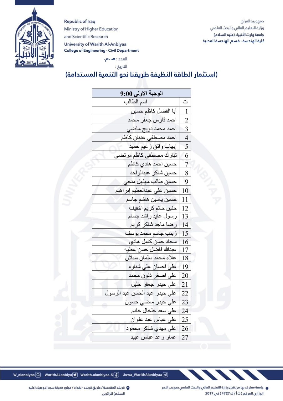 برنامَج التدريب الصيفي للطلبة الوافدين إلى قسم الهندسة المدنية - كلية الهندسة - جامعة وارث الأنبياء للعام الدراسي 2021 - 2022.