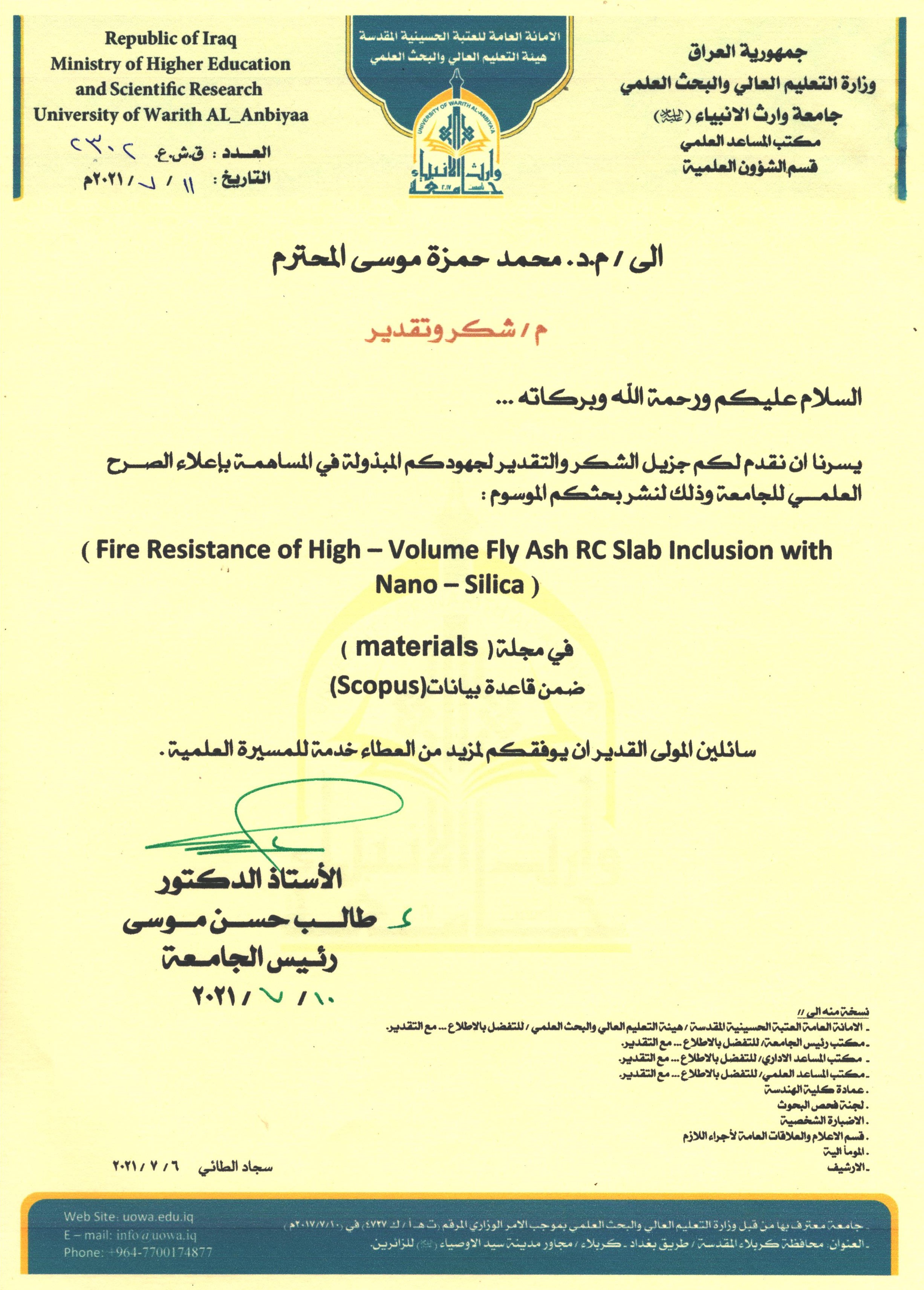 تتقدم جامعة وارث الأنبياء (ع) بالشكر و التقدير إلى م.د. محمد حمزة موسى التدريسي في قسم الهندسة المدنية لجهوده المبذولة في المساهمة بإعلاء الصرح العلمي للجامعة و ذلك لنشر بحثه الموسوم (Fire Resistance of High - Volume Fly Ash RC Slab Inclusion wuth Nano-Silica) في مجلة Materials ضمن قاعدة بيانات Scopus.