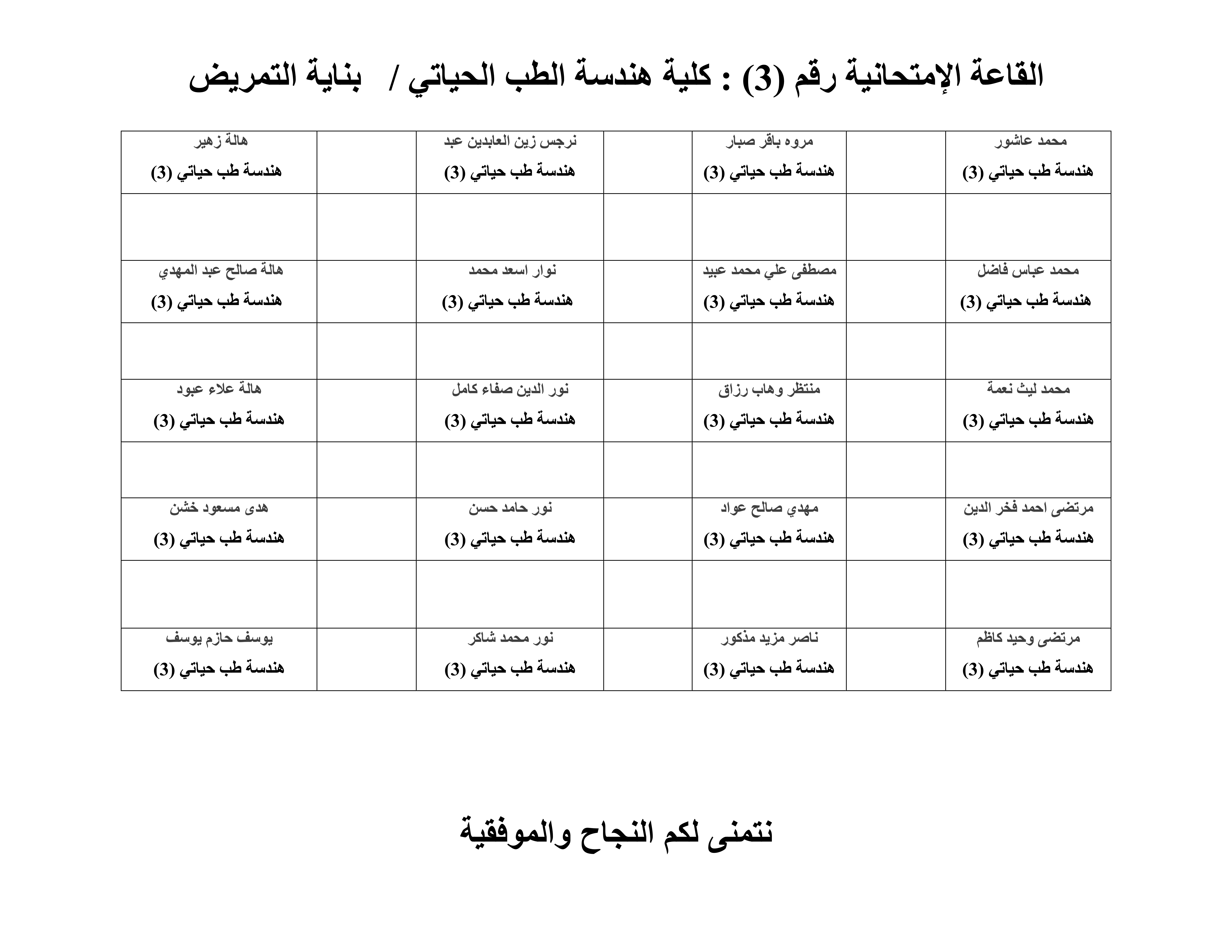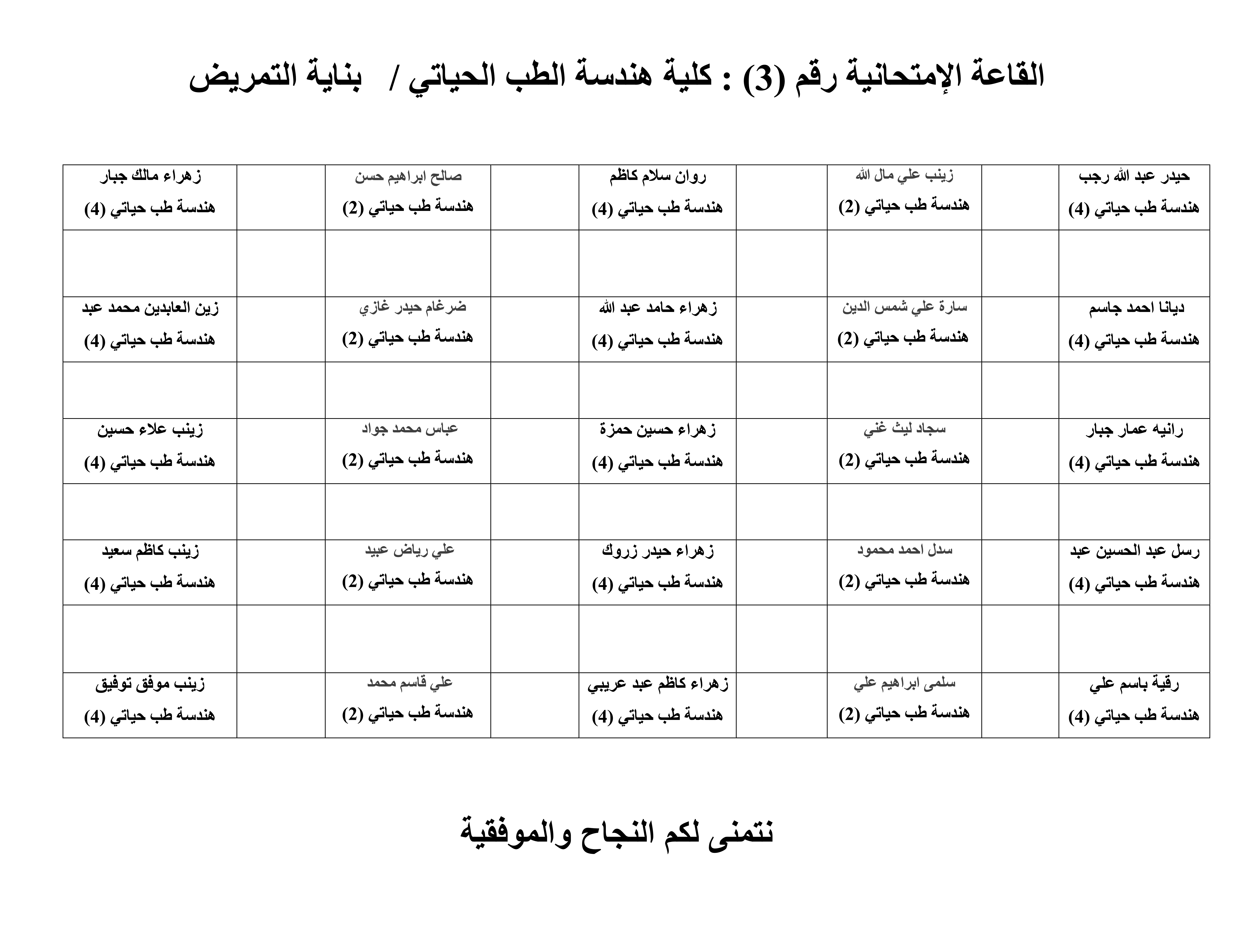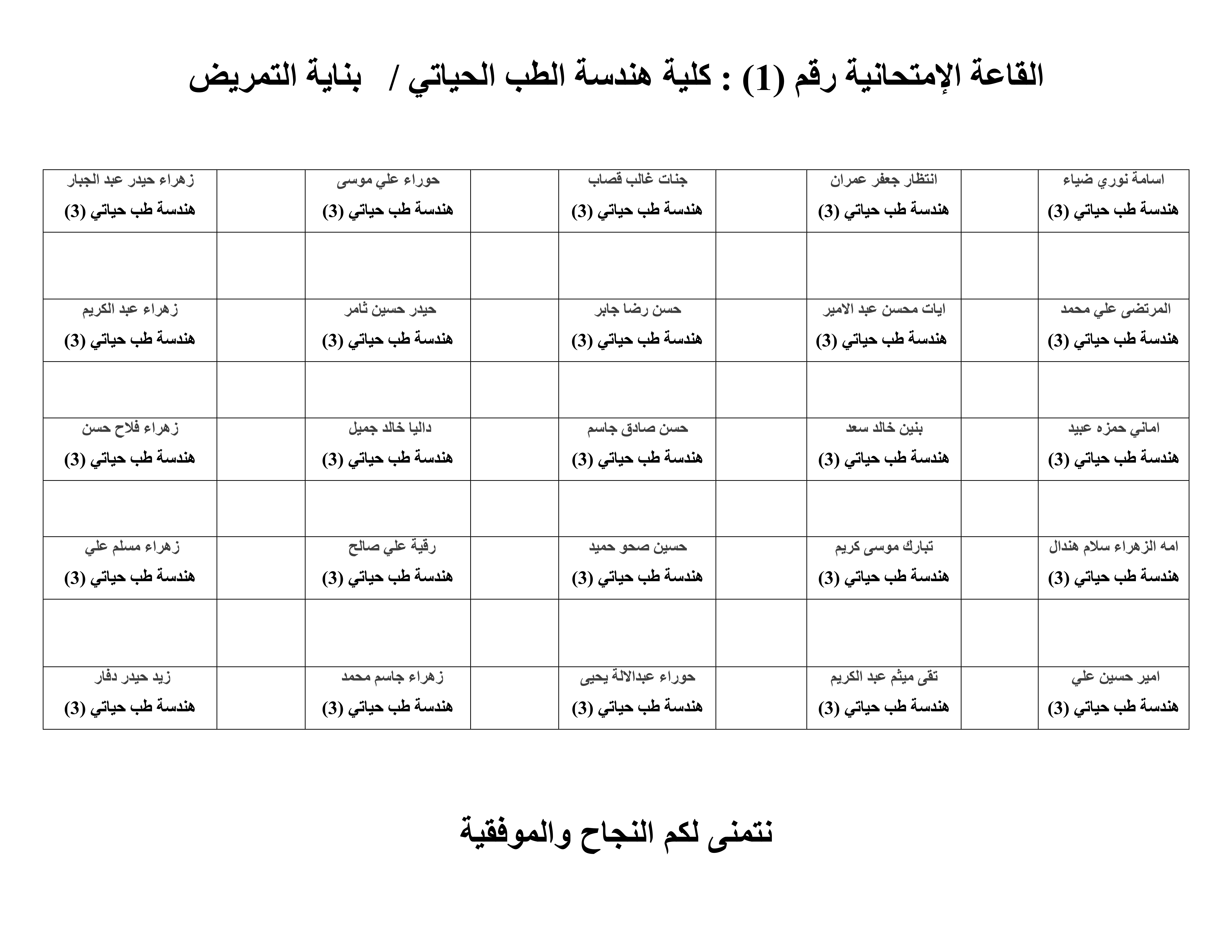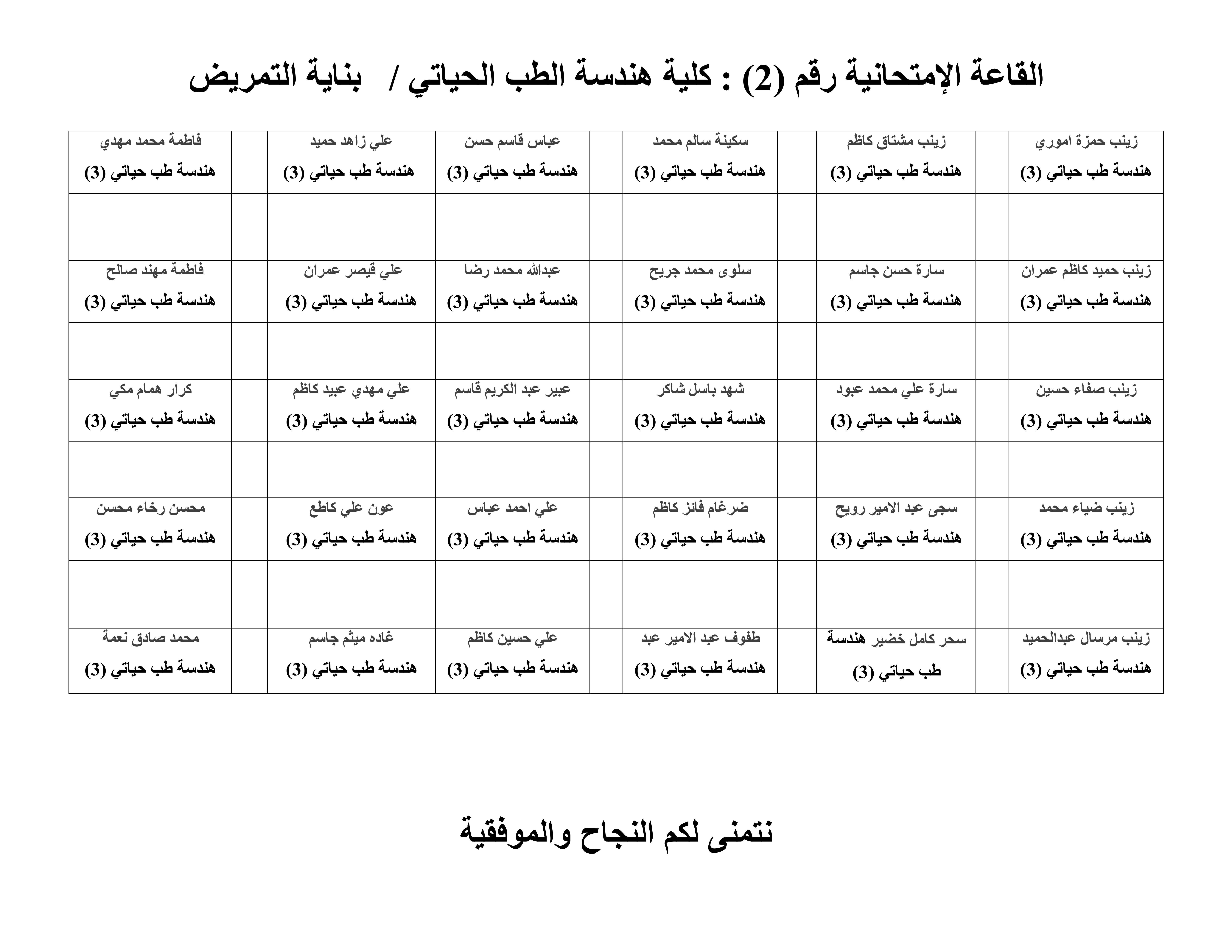 خارطة جلوس الطلبة لقسم هندسة الطب الحياتي
