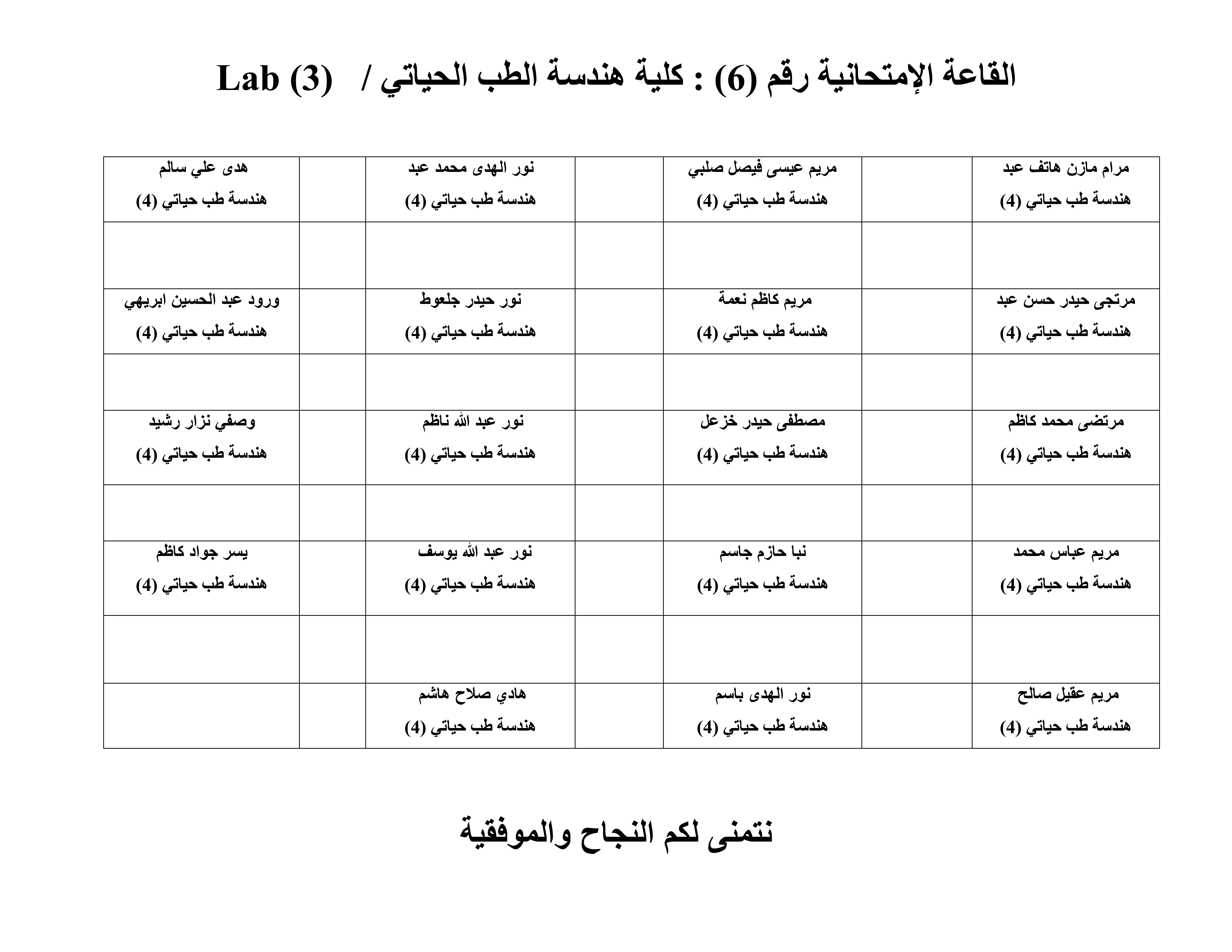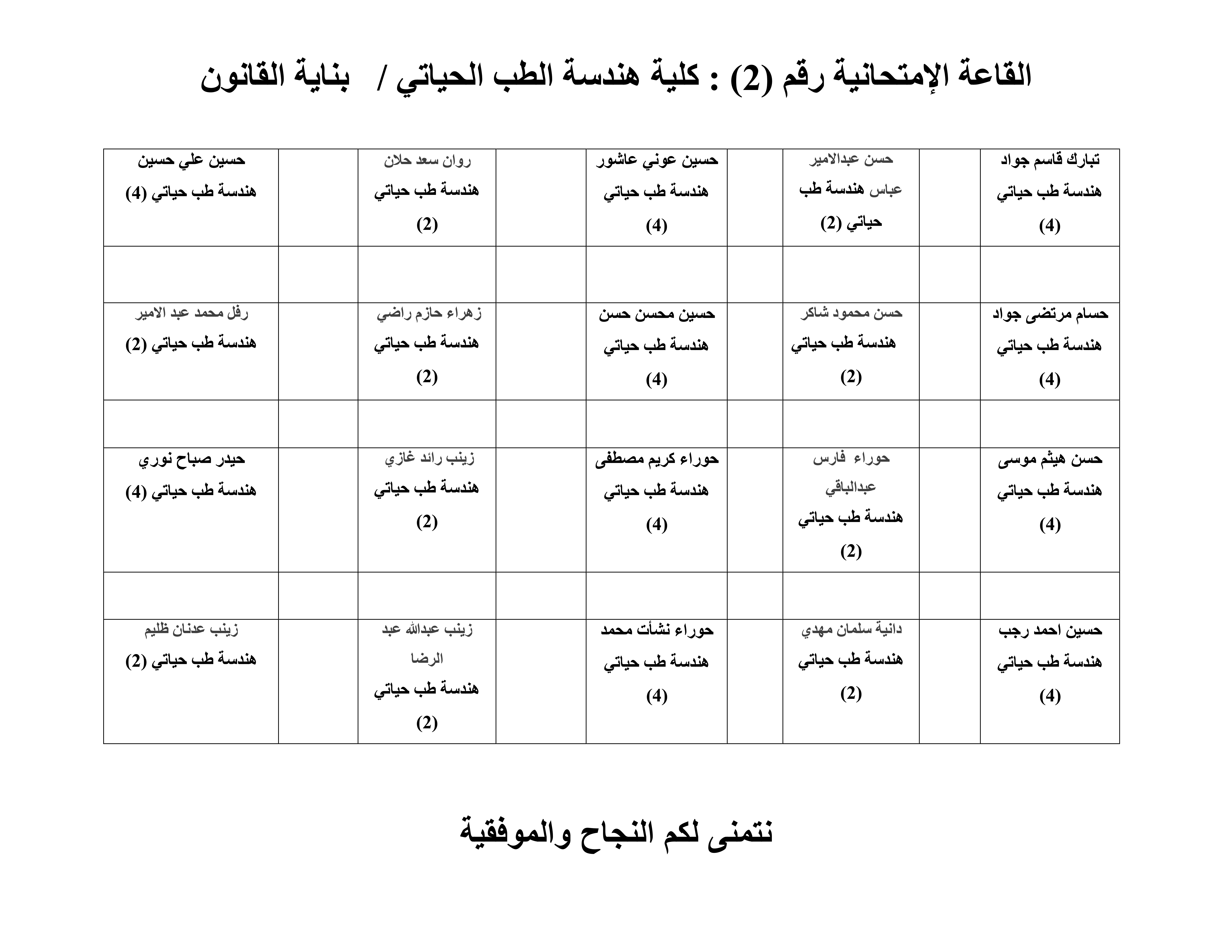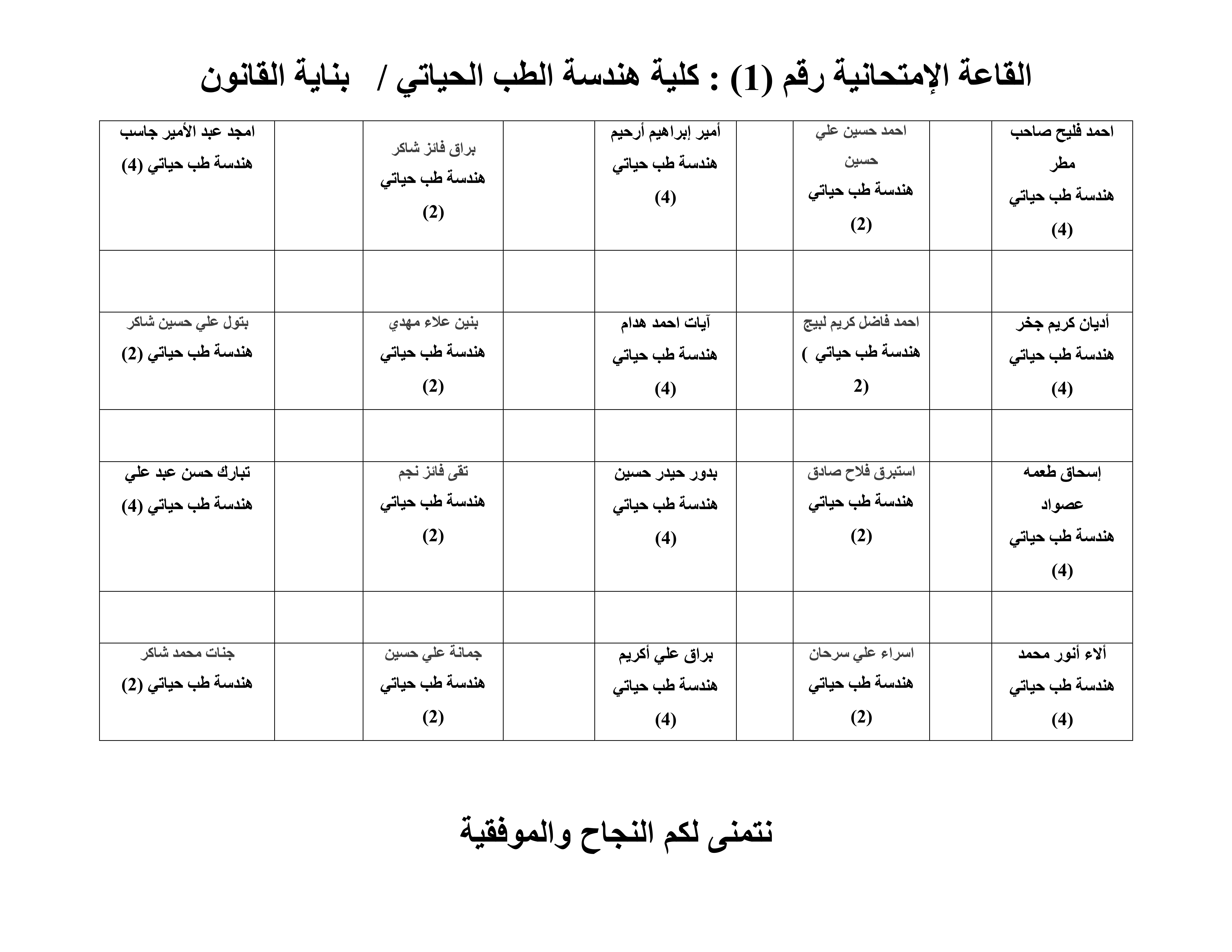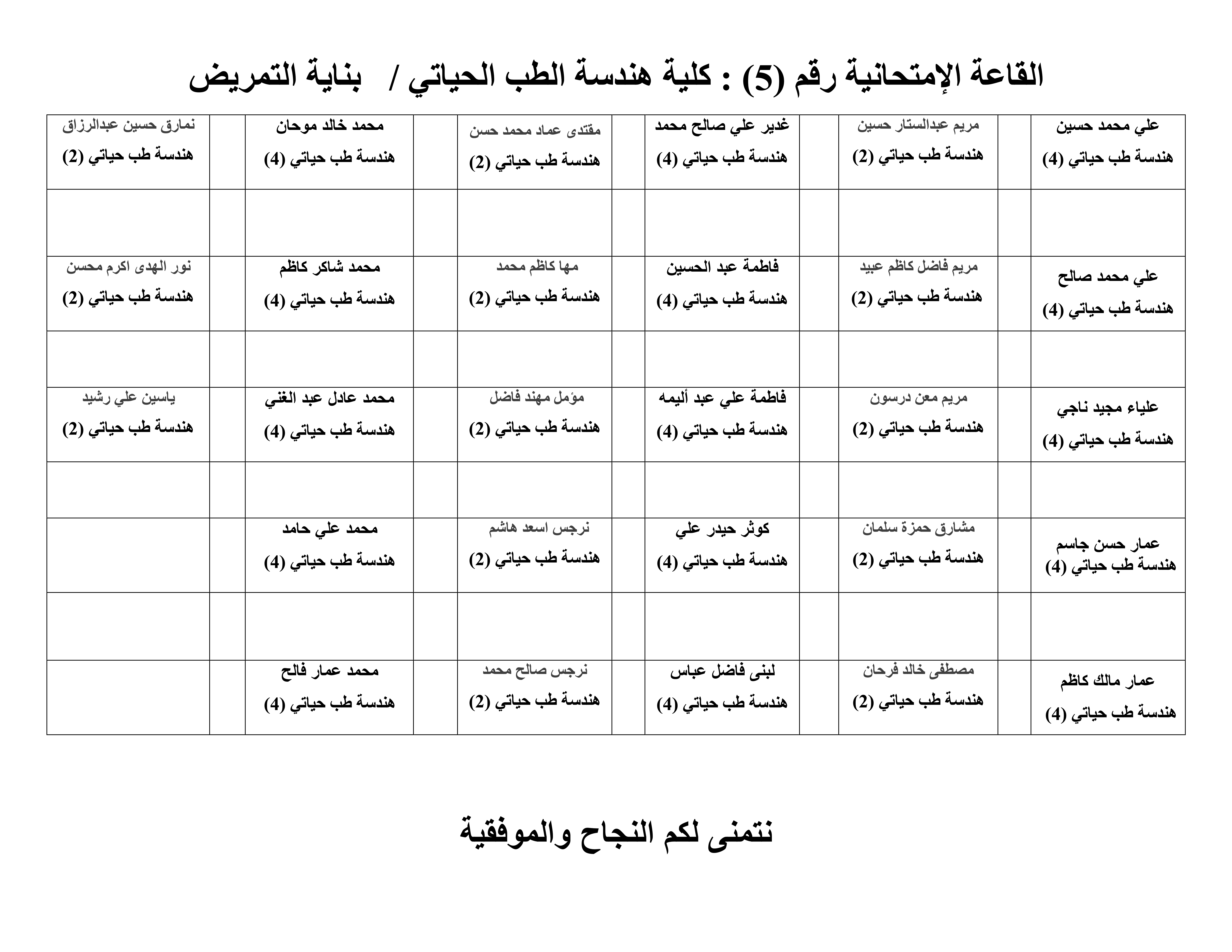 خارطة جلوس الطلبة لقسم هندسة الطب الحياتي
