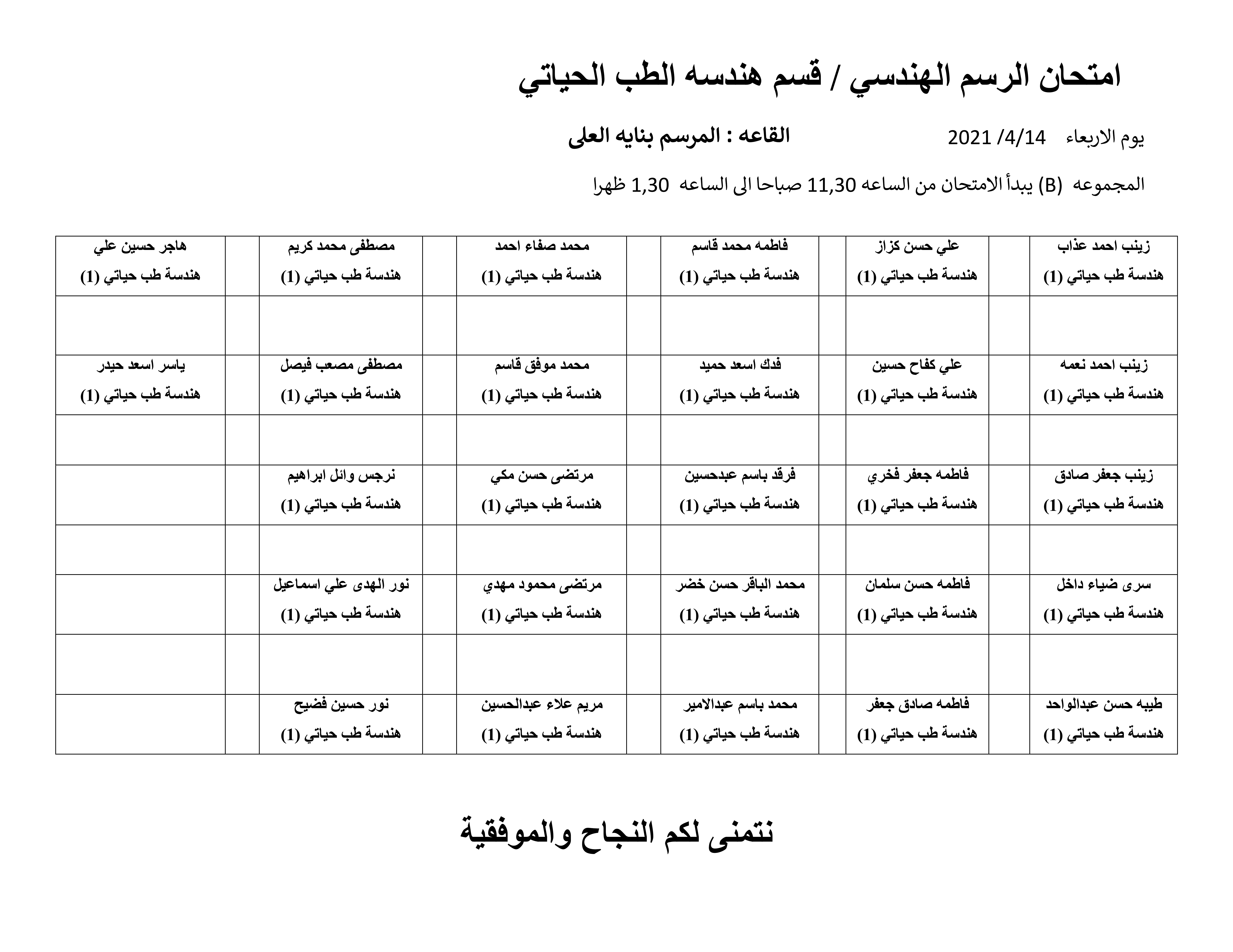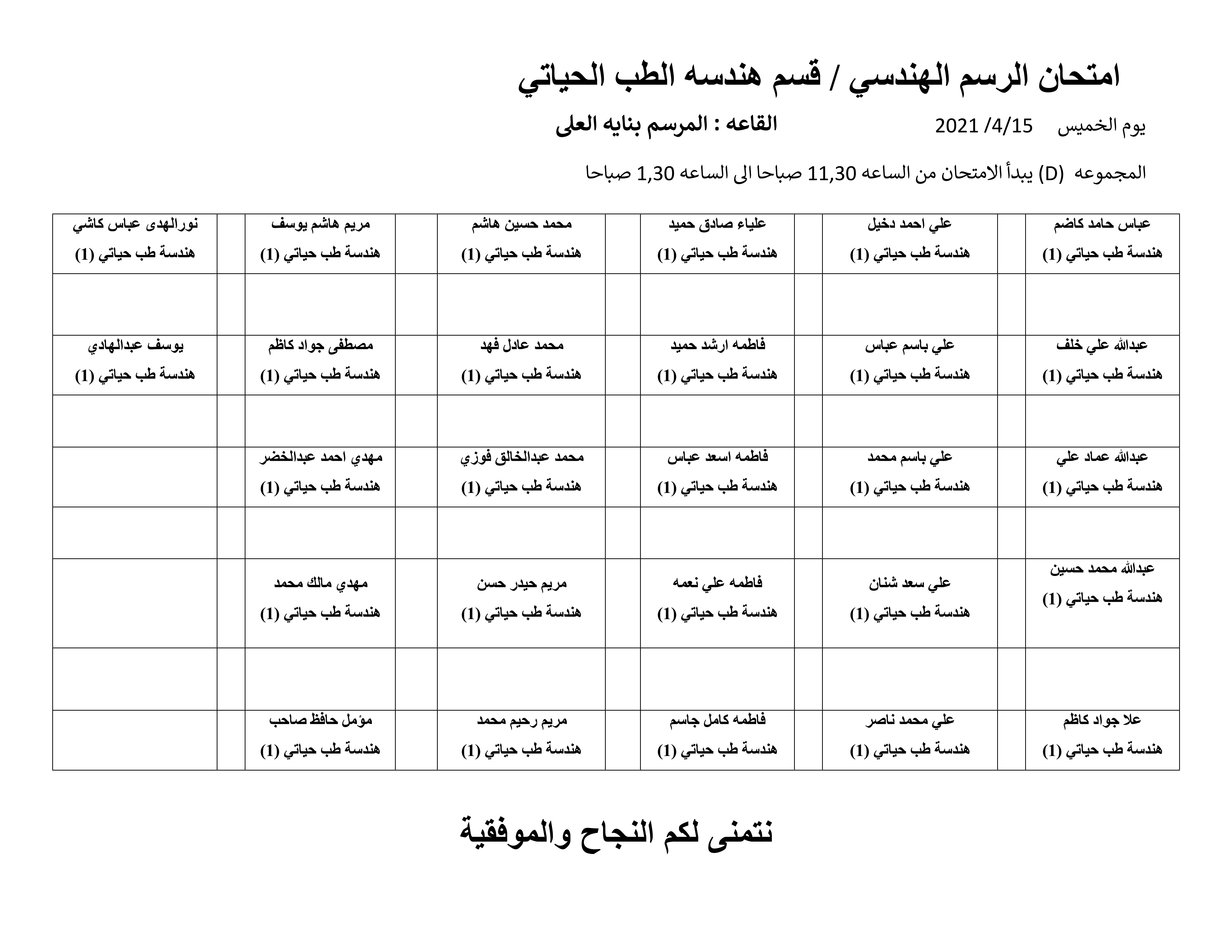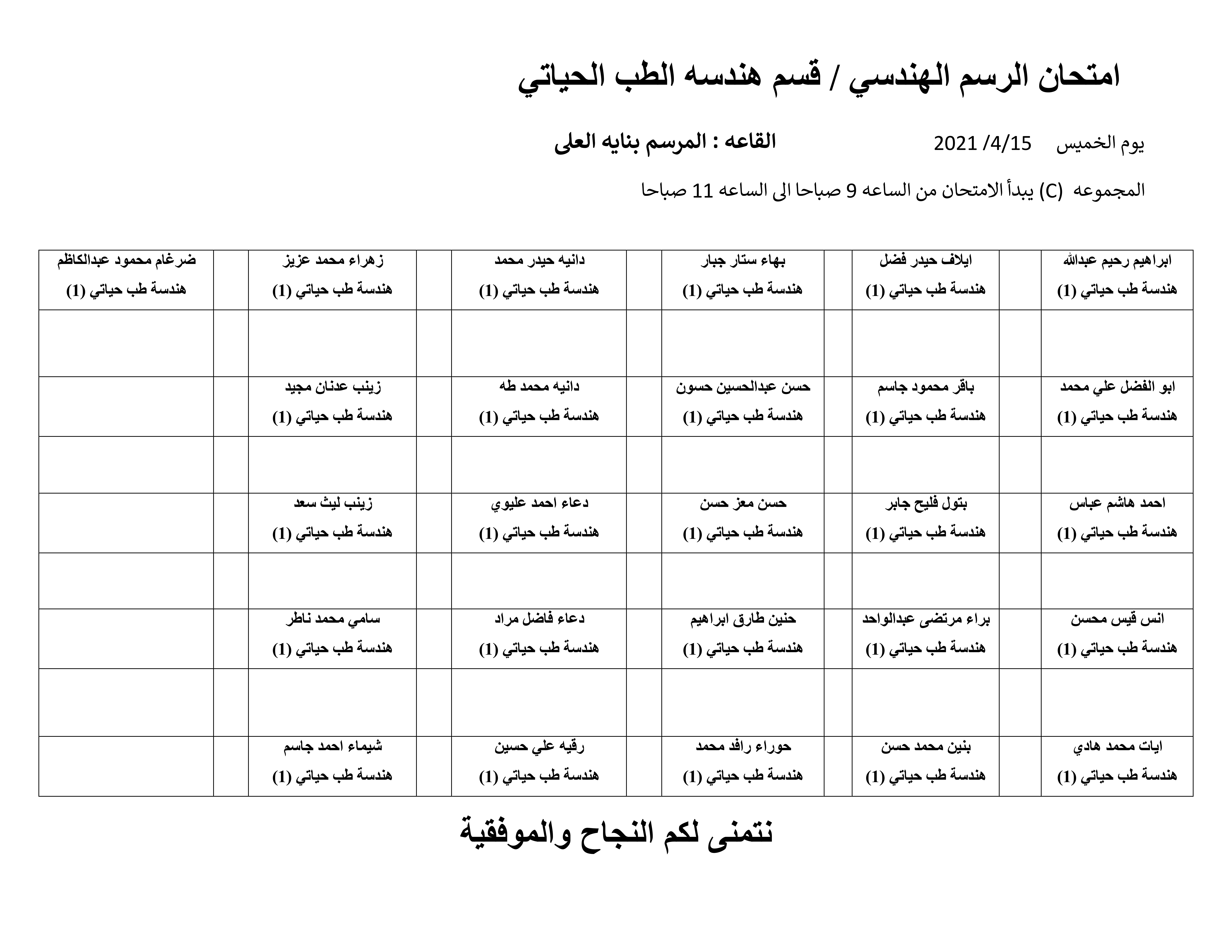 اسماء طلبة المرحلة الاولى في قسم الهندسة الطب الحياتي الخاصة بأمتحان الرسم الهندسي