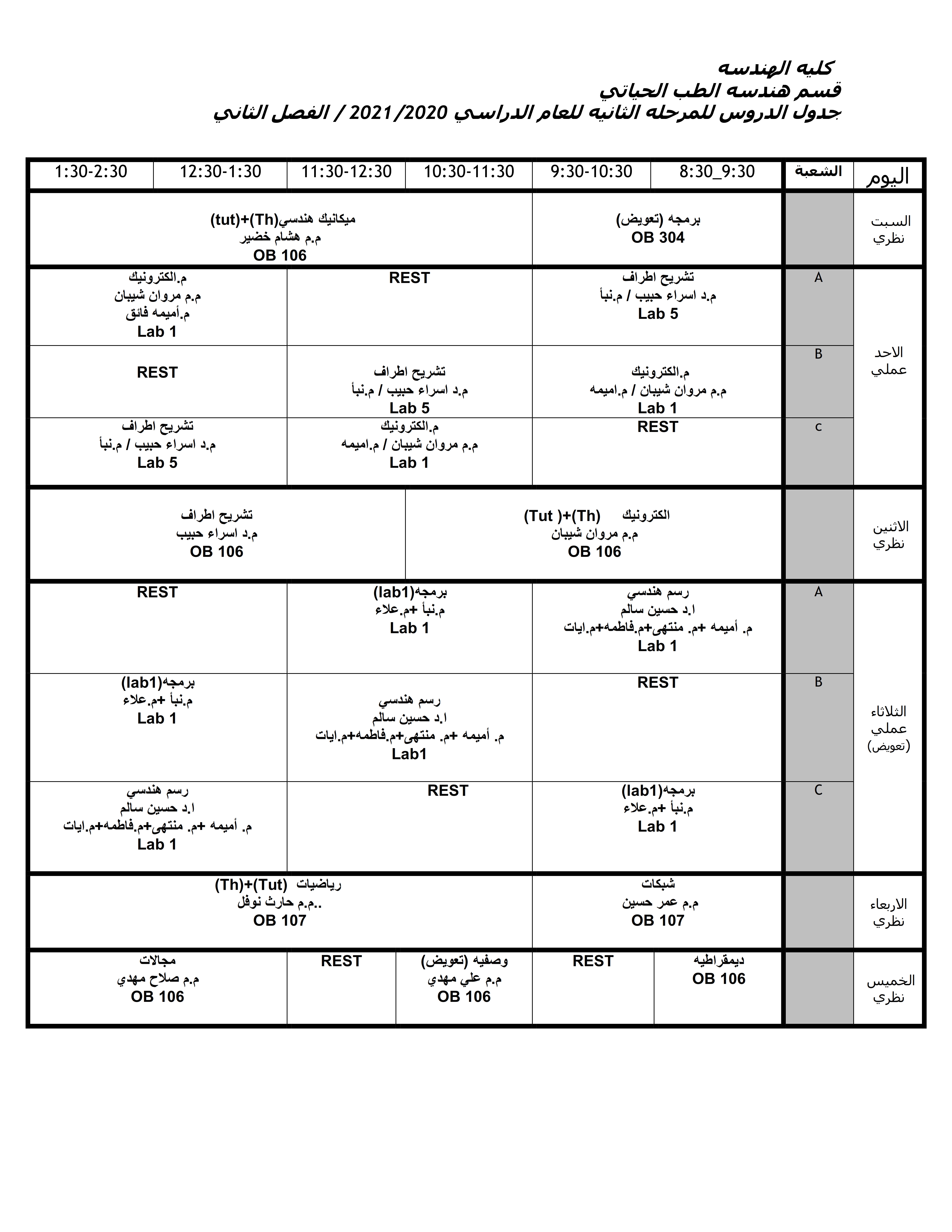 جدو الدروس الاسبوعي لقسم هندسة الطب الحياتي