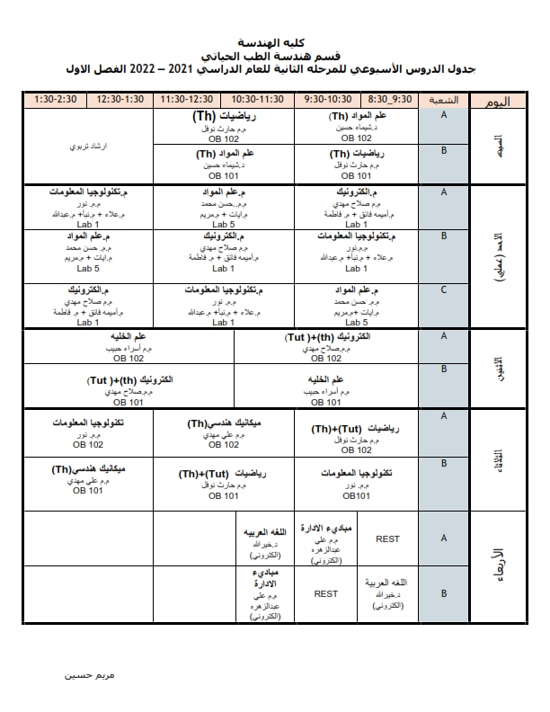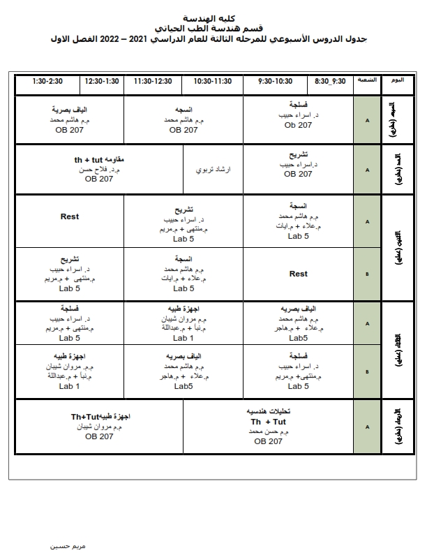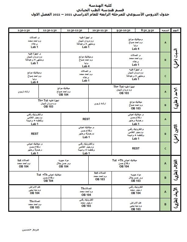 جدول الدروس الاسبوعي لقسم هندسة الطب الحياتي