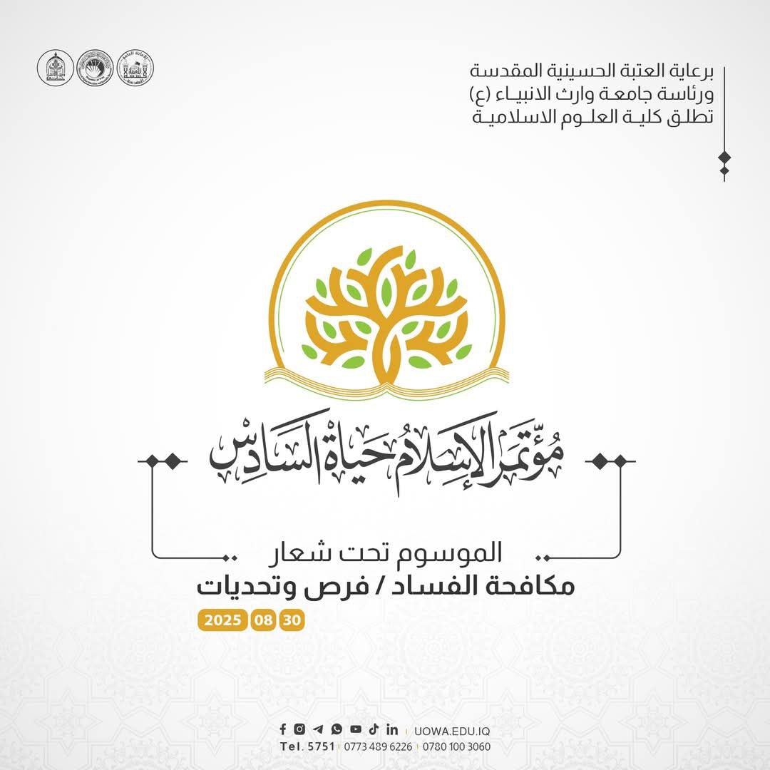 برعاية كريمة من الأمانة العامة للعتبة الحسينية المقدسة، وبإشراف مباشر من رئاسة جامعة وارث الأنبياء (عليه السلام)، تتشرف كلية العلوم الإسلامية بإطلاق فعاليات مؤتمرها العلمي الدولي السادس "الإسلام حياة" الموسوم: