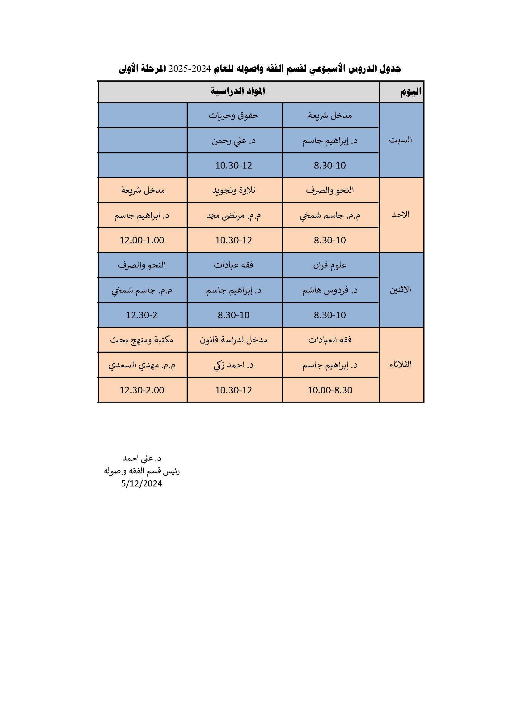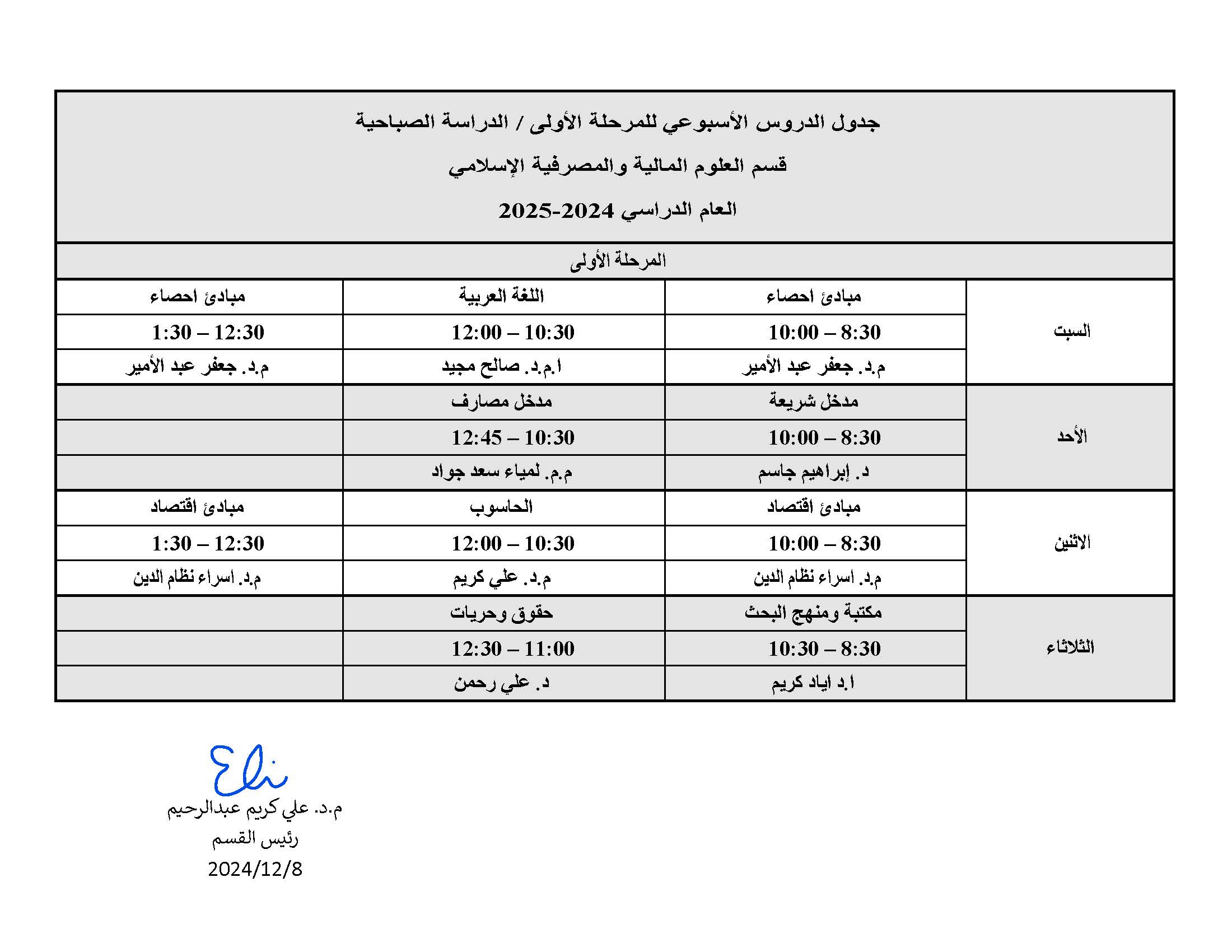 الطلبة الاعزاء, نرفق لكم جدول الدروس الاسبوعي للمرحلة الاولى قسم العلوم المالية والمصرفية الاسلامي للفصل الدراسي الاول