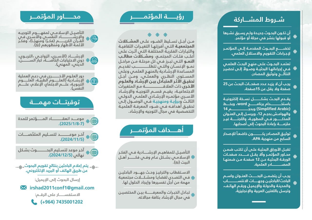 برعاية ومُباركة الأمانة العامّة للعتبة الحسينيّة المقدّسة، وتحت إشراف سماحة المتولّي الشرعيّ الشيخ عبد المهديّ الكربلائيّ (دام عزّه)، يُعلن قسم التوجيه والإرشاد الأسريّ عن إقامة مؤتمره الإرشاديّ العلميّ الدوليّ الثالث بعنوان: