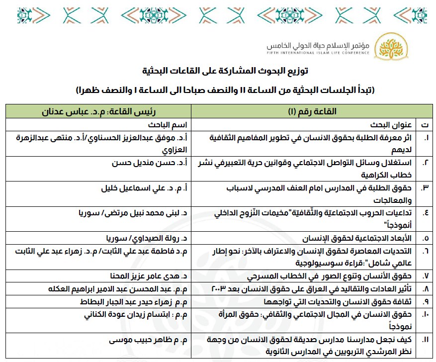 أقيم المؤتمر العلمي الخامس "الإسلام حياة" تحت شعار "حقوق الإنسان والتحديات المعاصرة" بمشاركة واسعة من جامعات العراق والدول العربية والأجنبية. وقالت الدكتورة نور مهدي الساعدي إن المؤتمر شهد تقديم 85 بحثًا من مختلف جامعات العراق، من السليمانية إلى البصرة، وهي سابقة تنفرد بها مؤتمرات كلية العلوم الإسلامية في جامعة وارث الأنبياء.
