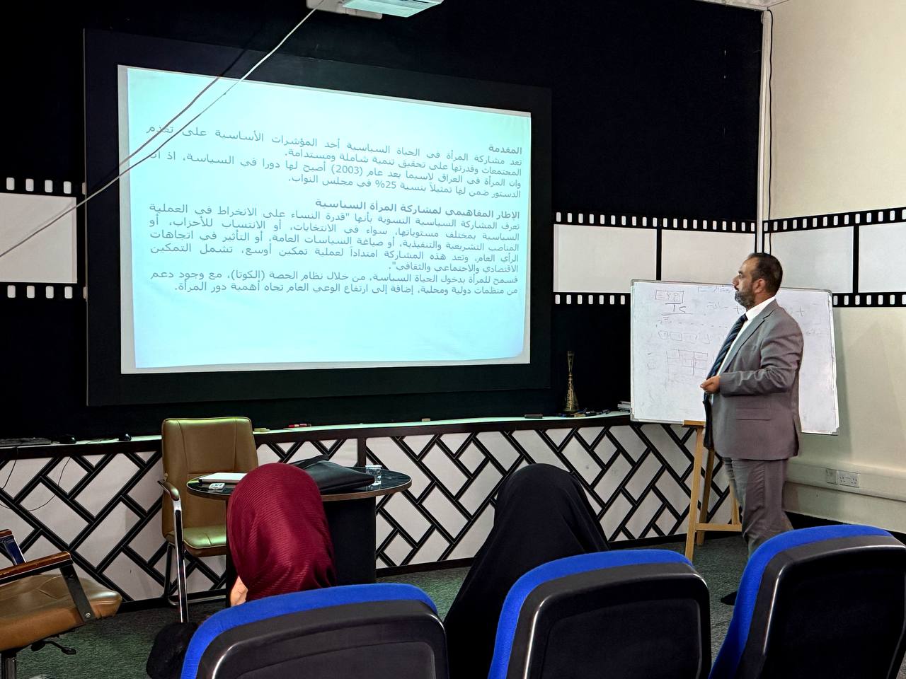 اقامت كلية الاعلام في جامعة وارث الانبياء عليه السلام، ندوة علمية حملت عنوان "تعزيز دور المرأة في السياسة العراقية لصنع التغيير" قدمها التدريسي في الكلية الاستاذ (ولاء شاكر محمود)، بين من خلالها ان المشاركة السياسية النسوية يعنى بها قدرة النساء على الانخراط في العملية السياسية بمختلف مستوياتها، سواء في الانتخابات، أو الانتساب للأحزاب، أو المناصب التشريعية والتنفيذية، أو صياغة السياسات العامة، أو التأثير في اتجاهات الرأي العام، وهي تمثل امتداداً لعملية تمكين أوسع، تشمل التمكين الاقتصادي والاجتماعي والثقافي.