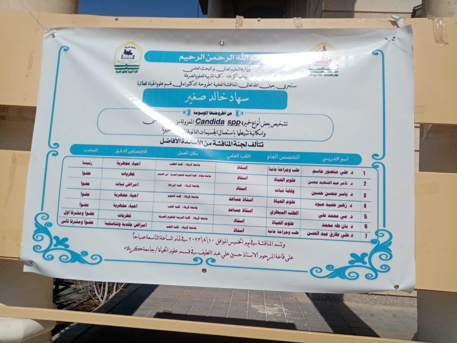 شارك الاستاذ الدكتور علي منصور جاسم معاون العميد للشؤون الادارية في كلية الطب جامعة وارث الانبياء عليه السلام في لجنة مناقشة الدكتوراه (رئيس اللجنة) في جامعة كربلاء كلية التربية للعلوم الصرفة للطالبة سهاد خالد صغير عن اطروحتها الموسومة تشخيص بعض انواع الخميرة Candida spp
