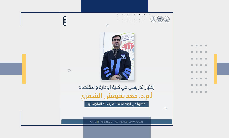 اختير الأستاذ المساعد الدكتور فهد مغيمش الشمري، التدريسي في كلية الإدارة والاقتصاد بجامعة وارث الأنبياء (عليه السلام)، عضواً في لجنة مناقشة رسالة ماجستير لأحد طلبة الدراسات العليا في كلية الإدارة والاقتصاد بجامعة القادسية، قسم العلوم المالية والمصرفية.