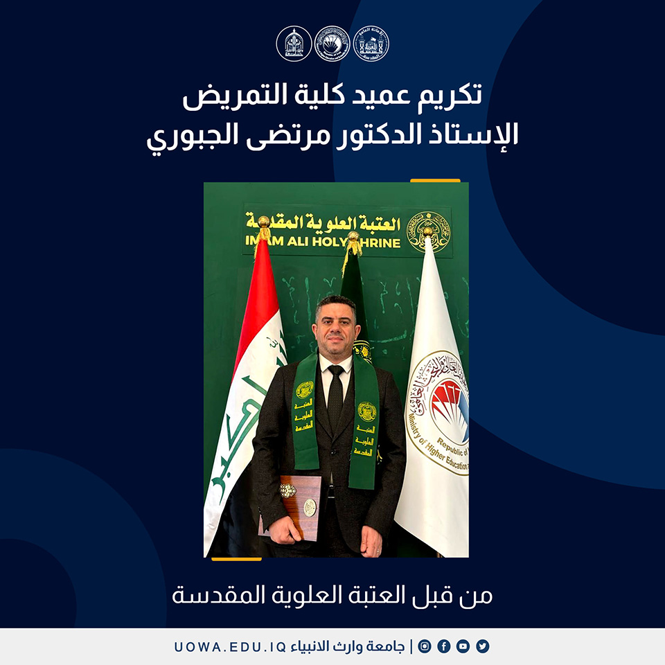 قامت العتبة العلوية المقدسة بتكريم الأستاذ الدكتور مرتضى الجبوري، عميد كلية التمريض في جامعة وارث الأنبياء (عليه السلام)، تقديرًا لجهوده وإنجازاته العلمية. تم تكريمه خلال حفل خاص أقيم كجزء من احتفالية العتبة العلوية المقدسة لتكريم نخبة من علماء العراق والمخترعين والأكاديميين المبدعين.