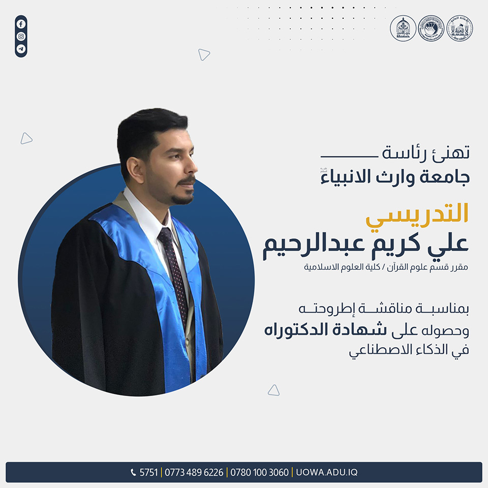 تهنئ رئاسة جامعة وارث الانبياء (عليه السلام)، علي كريم عبد الرحيم مقرر قسم علوم القران/ كلية العلوم الاسلامية.
