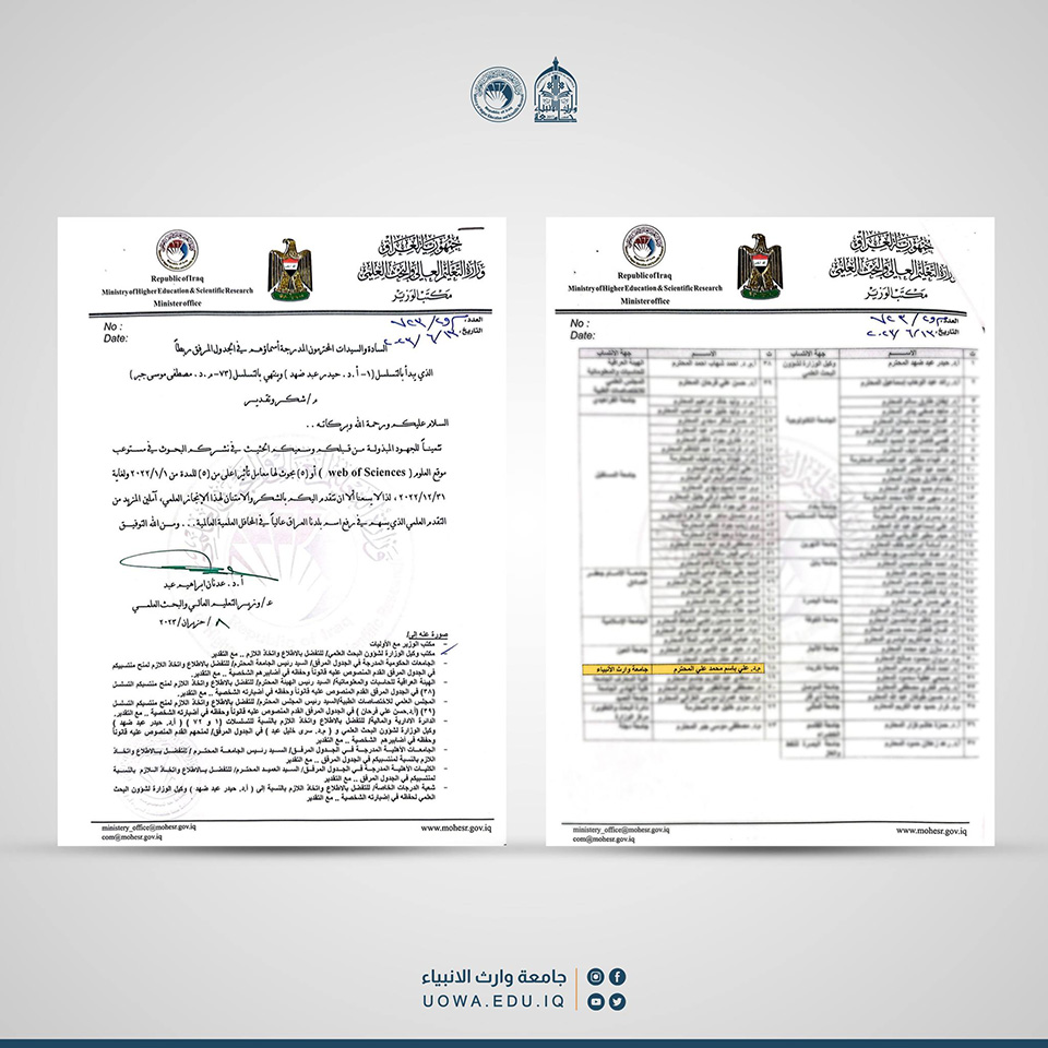 قدم وزير التعليم العالي والبحث العلمي كتاب شكر وتقدير للباحثين المتميزين عن جهودهم القيمة وسعيهم الحثيث في نشر البحوث العلمية في مستوعب موقع العلوم (Web of Science)، والتي تتمتع بمعامل تأثير يزيد عن(5).