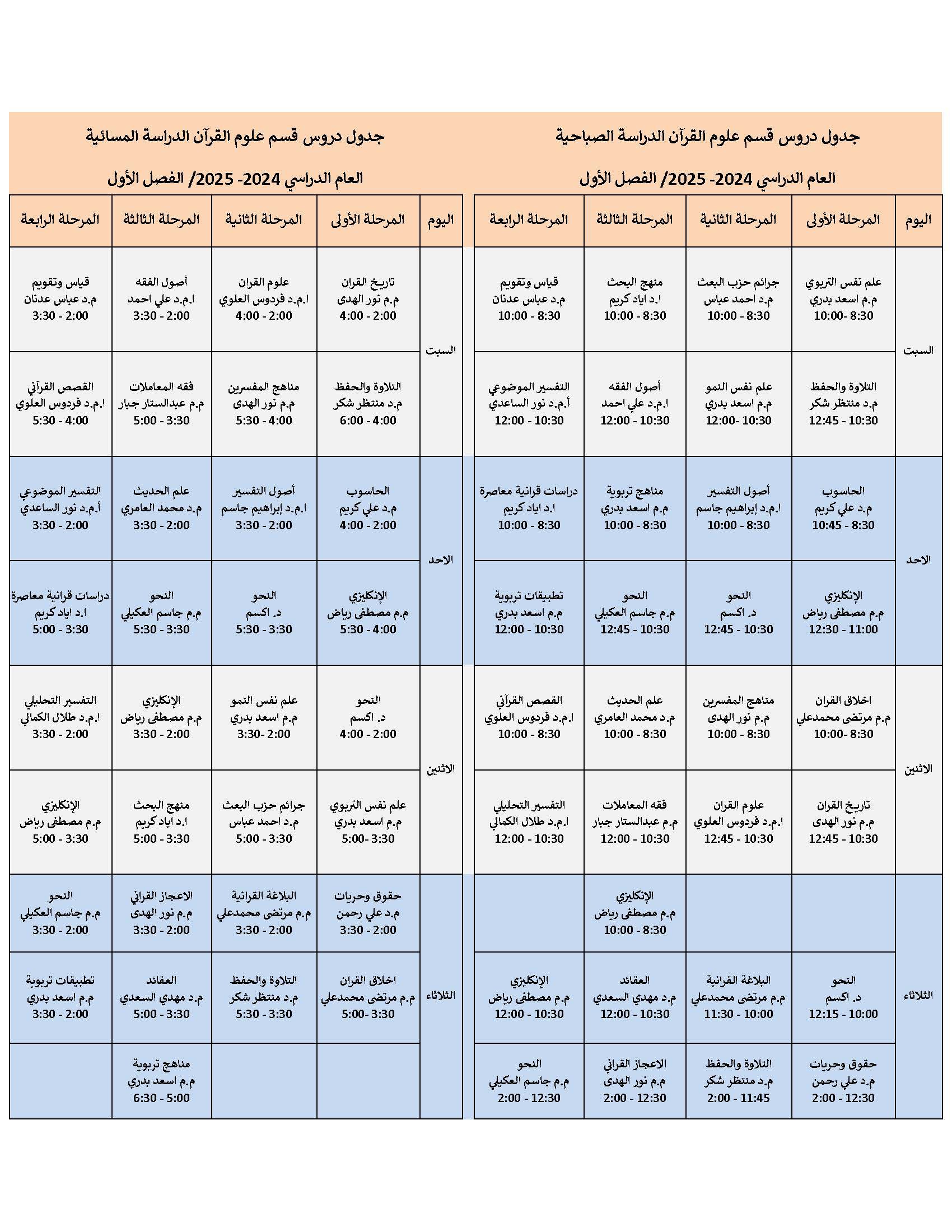 جدول الدروس الاسبوعي لقسم علوم القرآن تعلن كلية العلوم الإسلامية في جامعة وارث الأنبياء (عليه السلام) عن موعد بدء الدراسة لطلاب المرحلة الأولى، حيث سيكون انطلاق العام الدراسي الجديد يوم السبت الموافق 7 ديسمبر 2024. ندعو جميع الطلبة الأعزاء إلى الحضور في القاعات الدراسية تمام الساعة 8:30 صباحًا للدراسة الصباحية و الساعة 2:00 للدراسة المسائية وبحسب الجدول ، حيث سيتم استقبالهم والترحيب بهم من قبل عمادة الكلية والهيئة التدريسية. نتمنى لجميع الطلبة عامًا دراسيًا موفقًا ومليئًا بالنجاح والتميز.