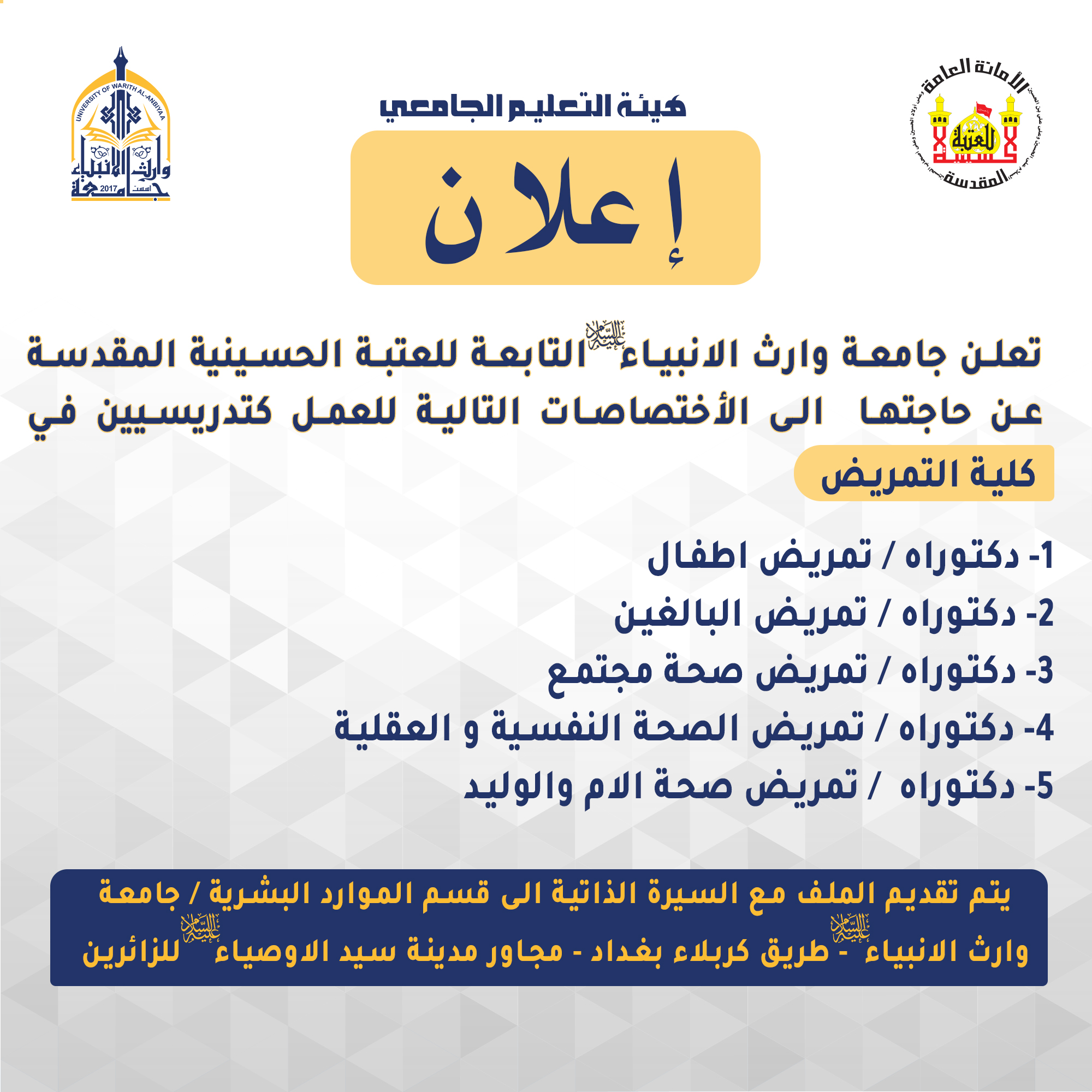 تتقدم عمادة كلية التمريض المتمثلة بالاستاذ المساعد الدكتور مرتضى غانم الجبوري عميد الكلية والملاك التدريسي والفني بالتهنئة الخالصة الى الامة الاسلامية بمناسبة عيد الاضحى المبارك