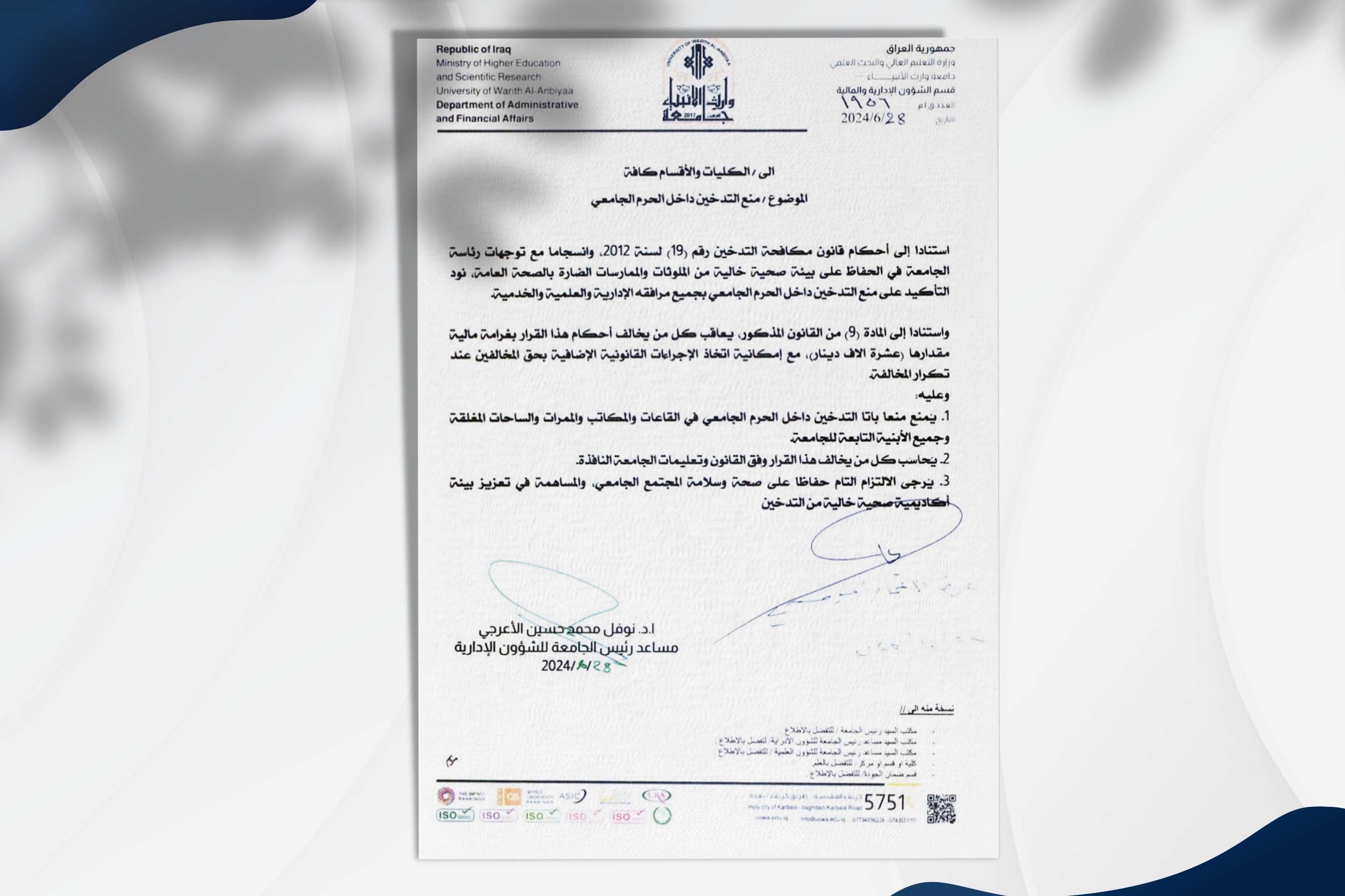 استنادا إلى أحكام قانون مكافحة التدخين رقم (19) لسنة 2012، وانسجاما مع توجهات رئاسة الجامعة في الحفاظ على بينة صحية خالية من الملونات والممارسات الضارة بالصحة العامة، نود التأكيد على منع التدخين داخل الحرم الجامعي بجميع مرافقه الإدارية والعلمية والخدمية.