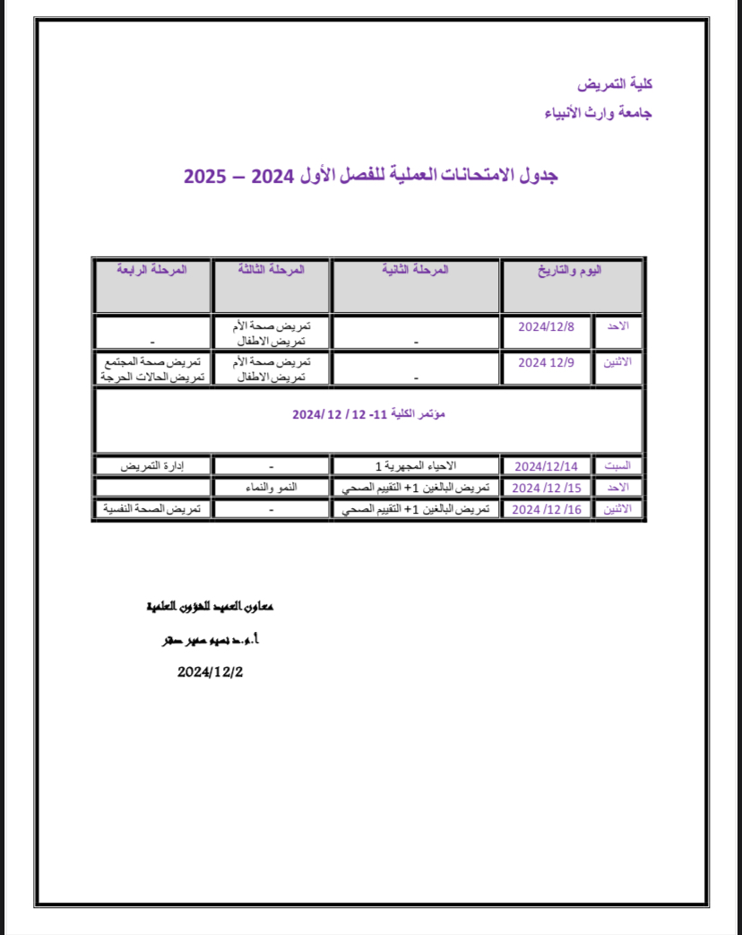 جدول امتحانات الفصل الدراسي الاول للعام 2024-2025 للمرحلة الثانية والثالثة والرابعة