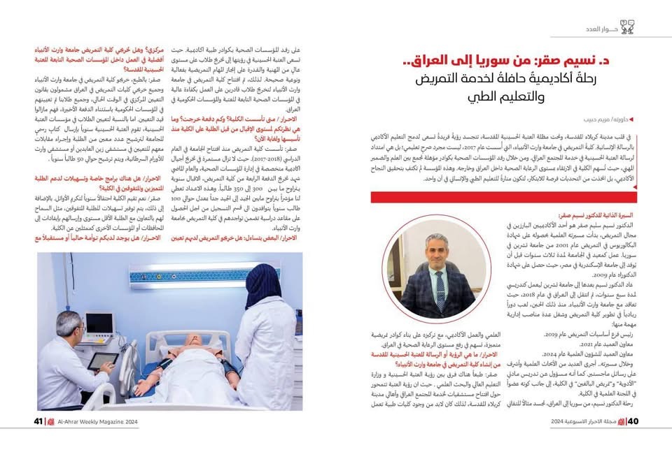 مجلة الاحرار تلتقى الدكتور نسيم تناول الحوار عدة نقاط مهمة حول تعليم التمريض و دور العتبة في تحسين الواقع الصحي، حيث ناقش خلاله رحلته الأكاديمية وتجربته في خدمة التمريض والتعليم الطبي، خصوصًا في سياق العتبة الحسينية المقدسة. يمكن أن يتناول الحوار جوانب متعددة مثل التحديات التي واجهها، الإنجازات التي حققها، وأهمية التعاون بين في المجال التعليم الصحي. والطبي من المهم تسليط الضوء على دور العتبة الحسينية في دعم البرامج التعليمية والرعاية الصحية.