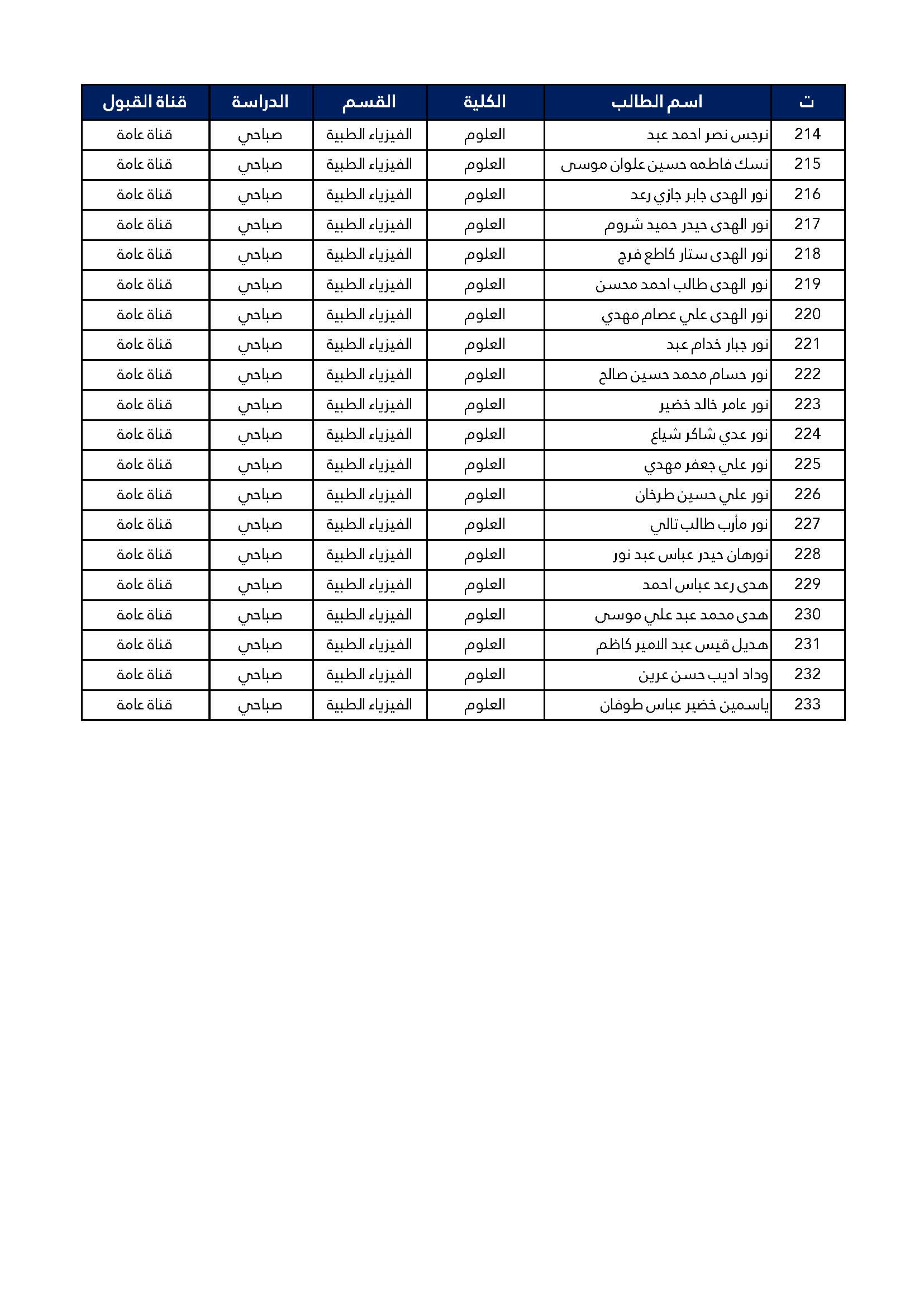 اسماء الطلبة المقبولين للدراسة الصباحية للمرحلة الاولى كلية العلوم قسم الفيزياء الطبية
