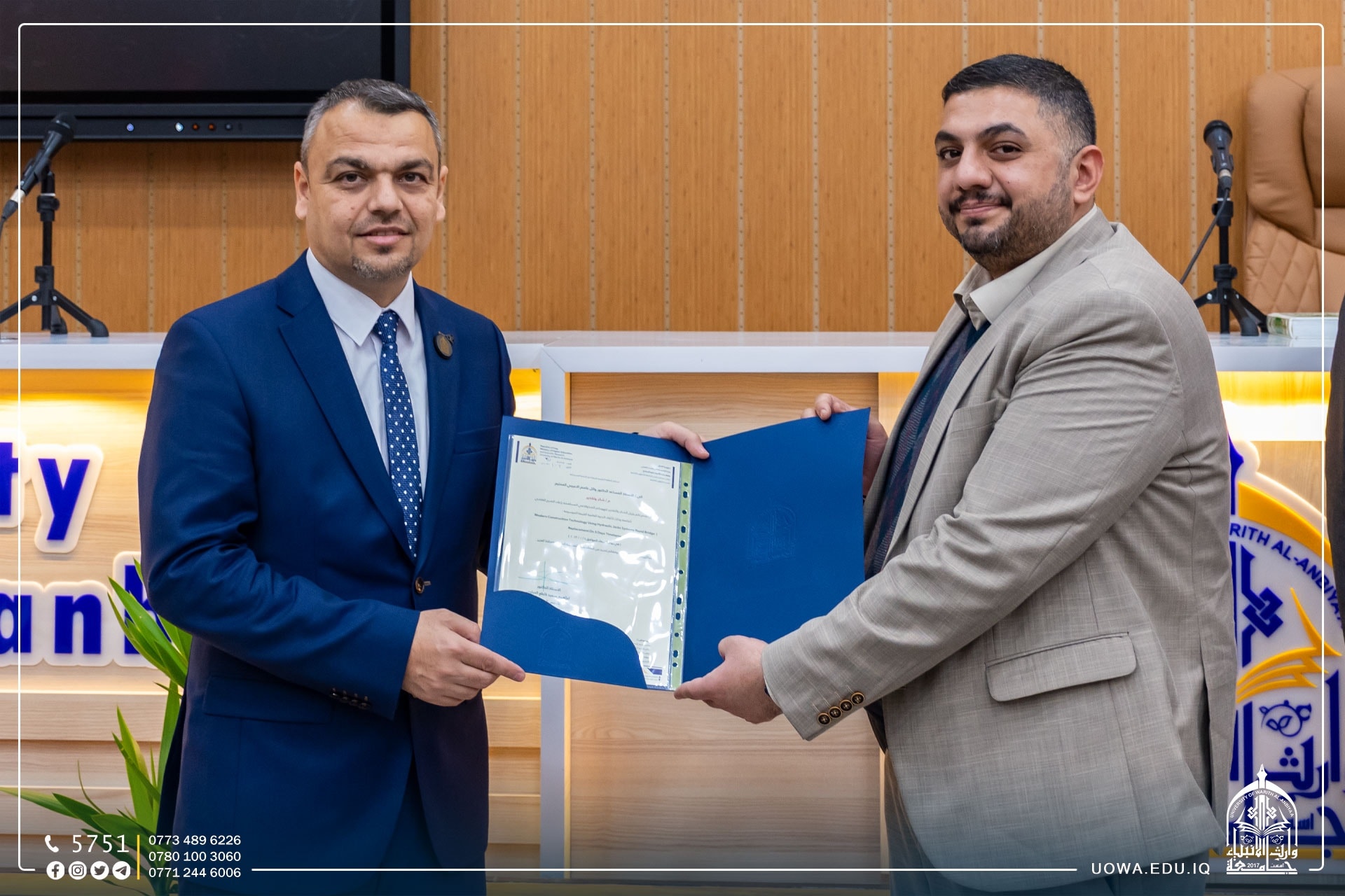ترأس الاستاذ المساعد الدكتور أنمار فالح ديكان جلستين في المؤتمر الدولي الثاني للعلوم الهندسية والتكنلوجية لجامعة المثنى.وقال أ.م.د أنمار فالح : "أن المؤتمر استقبل (169) ورقة بحثية من مختلف الجامعات العراقية والعالمية، وكان لباحثي جامعة وارث الانبياء حضور متميز عبر مشاركتهم بـ (12) بحثاً علمياً، فضلاً عن ترأس كل من الدكتور مصطفى نعيم والدكتور مصطفى كريم والاستاذ ماهر خضر لجلسات المؤتمر".تجدر الإشارة إلى أن البحوث المقبولة سوف تنشر في مجلات علمية مفهرسة في المستوعبات العالمية.