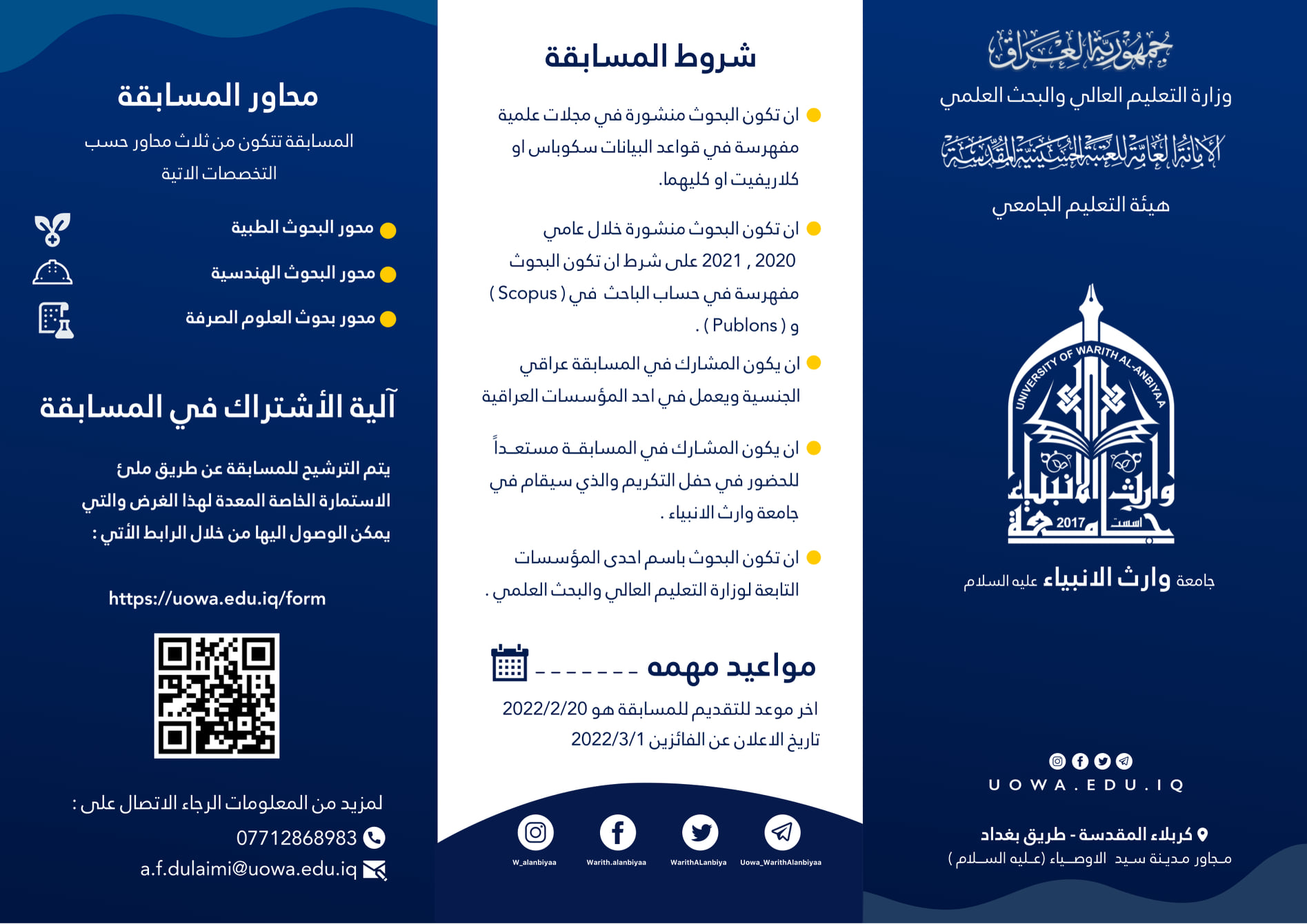 تحت شعار ( البحث العلمي الرصين مقياساً لرقي الأمم وتطورها) تدعو جامعة وارث الأنبياء (عليه السلام) السادة الباحثين للاشتراك في مسابقتها الأولى لتكريم أفضل الباحثين الأكاديميين العراقيين المتميزين في النشر العلمي الرصين في التخصصات الطبية، والهندسية، و العلوم الصرفة،*علما أن آخر يوم للاشتراك بالمسابقة هو اليوم الاحد الموافق 20/2/2022*إيماناً منها بأهمية البحث العلمي الرصين فقد قررت الجامعة الجوائز التالية ولكل محور:*الجائزة الأولى: 3 مليون دينار*الجائزة الثانية: 2 مليون دينار*الجائزة الثالثة: 1 مليون دينارإضافة الى شهادة تميز شرفية وتقديرية وجوائز للفائزين من التسلسل الرابع ولغاية العاشر ولكل محور من محاور المسابقة.* رابط الاشتراك في كروب مسابقة وارث الأنبياء للتميز البحثي الأولى:* https://t.me/+HH3KRAc4CyphYzU8* رابط التقديم على المسابقة:* https://uowa.edu.iq/form