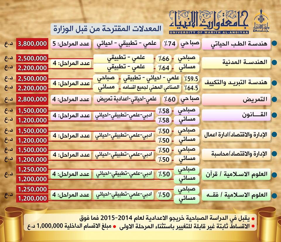 خفضت وزارة التعليم العالي والبحث العلمي العلمي الحدود الدنيا للقبول في الكليات والجامعات الأهليّة وأصبحت المعدلات المقبولة في جامعة وارث الانبياء (ع) كما يأتي :١- هندسة الطب الحياتي(علمي احيائي تطبيقي) ٧١.٥٢-هندسة مدني (علمي-تطبيقي)صباحي ٦٣.٥ والمسائي ٦١.٥٣-هندسة تقنيات التكييف والتبريد الصباحي والمسائي (للعلمي الاحيائي والتطبيقي )٥٩.٥اما بلنسبة للصناعة ٦٢.٥ للدراستين الصباحيةوالمسائية٤-التمريض (علمي احيائي اعدادية تمريض)٥٩.٥ ٥- القانون (علمي ادبي احيائي تطبيقي)الصباحي والمسائي ٥٦.٥٦- الادارة والاقتصاد -#المحاسبة و #ادارة الاعمال ( علمي ادبي احيائي تطبيقي تجارة عامة تجارة محاسبة تجارة ادارة اعمال ) للدراستين الصباحي والمسائي ٥٠٧- العلوم الاسلامية (القران والفقة واصولة ) علمي ادبي احيائي تطبيقي مهني اسلامي ٥٠٪