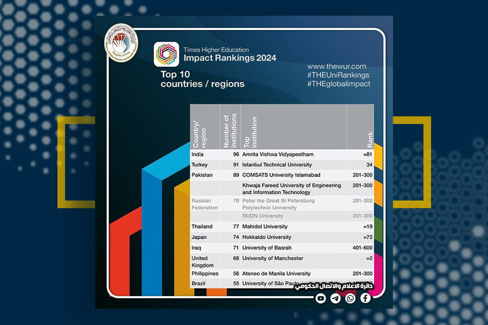 في إنجاز يعكس جودة التعليم الجامعي في العراق، أعلنت وزارة التعليم العالي والبحث العلمي أن العراق حقق المرتبة الأولى عربياً والسابعة عالمياً في تصنيف التايمز للتنمية المستدامة (Times Higher Education Impact Rankings 2024). جاء هذا التميز بناءً على عدد الجامعات العراقية المشاركة في نسخة 2024 من التصنيف، الذي شهد تنافس 2152 مؤسسة تعليمية من 125 دولة حول العالم.