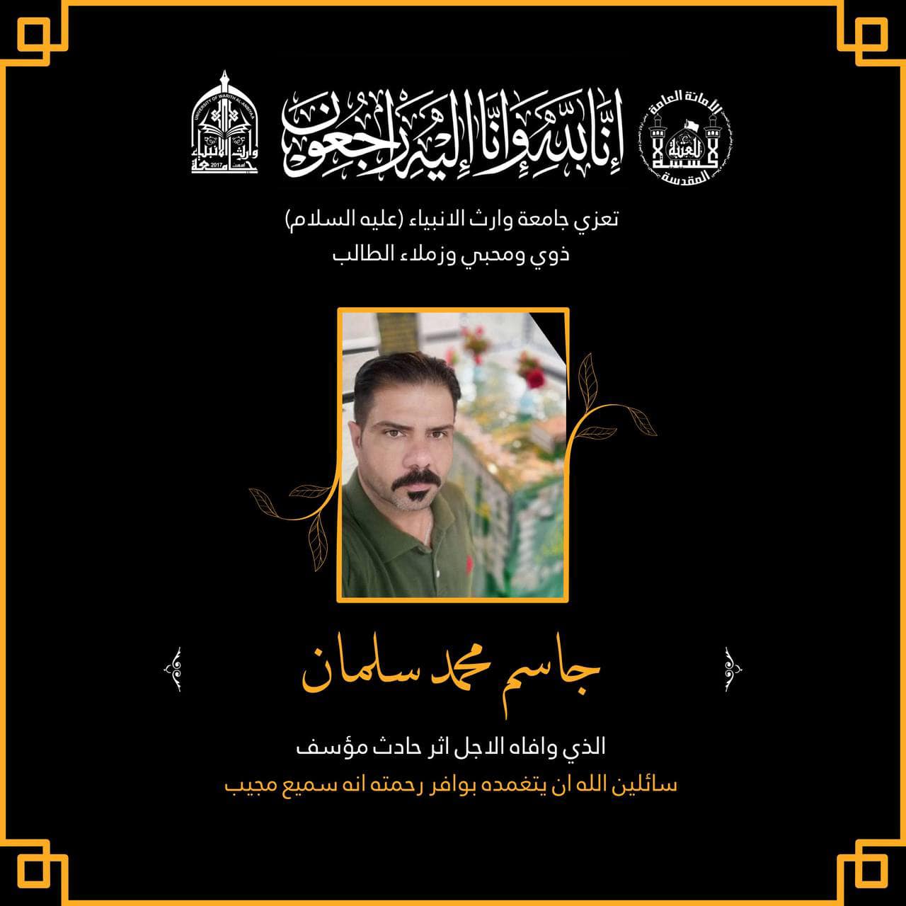 بسم الله الرحمن الرحيم(كُلُّ نَفْسٍ ذَائِقَةُ الْمَوْتِ ۗ وَإِنَّمَا تُوَفَّوْنَ أُجُورَكُمْ يَوْمَ الْقِيَامَةِ ۖ )صدق الله العلي العظيمتعزي جامعة وارث الانبياء(عليه السلام) ذوي ومحبي وزملاء المرحوم (جاسم محمد) الطالب في كلية العلوم الاسلامية/ المرحلة الثانية/ الدراسة المسائيةالذي وافاه الأجل اثر حادث مؤسف، نسأل الله تعالى أن يتغمد المرحوم بوافر رحمته ويلهم أهله وذويه الصبر والسلوان إنه سميع مجيب .وانا لله وانا اليه راجعون