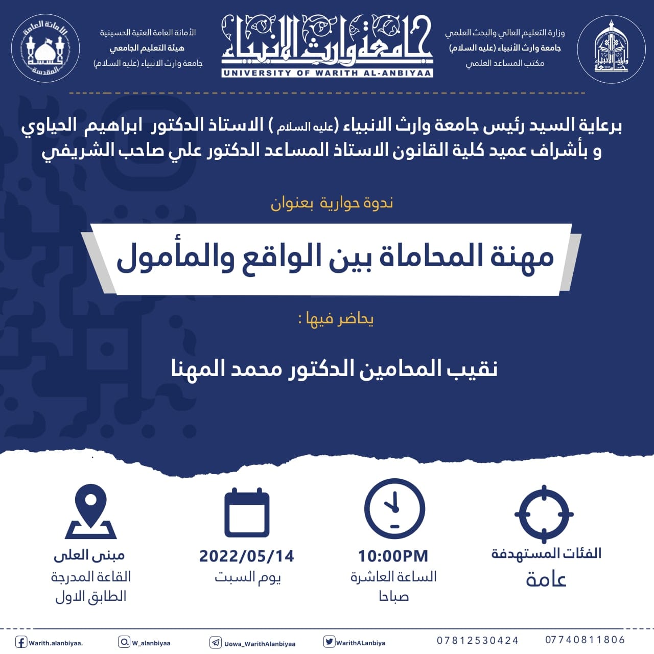 برعاية رئيس الجامعة الاستاذ الدكتور ابراهيم الحياوي تقيم كلية القانون ندوة حوارية بعنوان "بناء قبور الأئمة عليهم السلام تأصيل ديني وحماية قانونية"