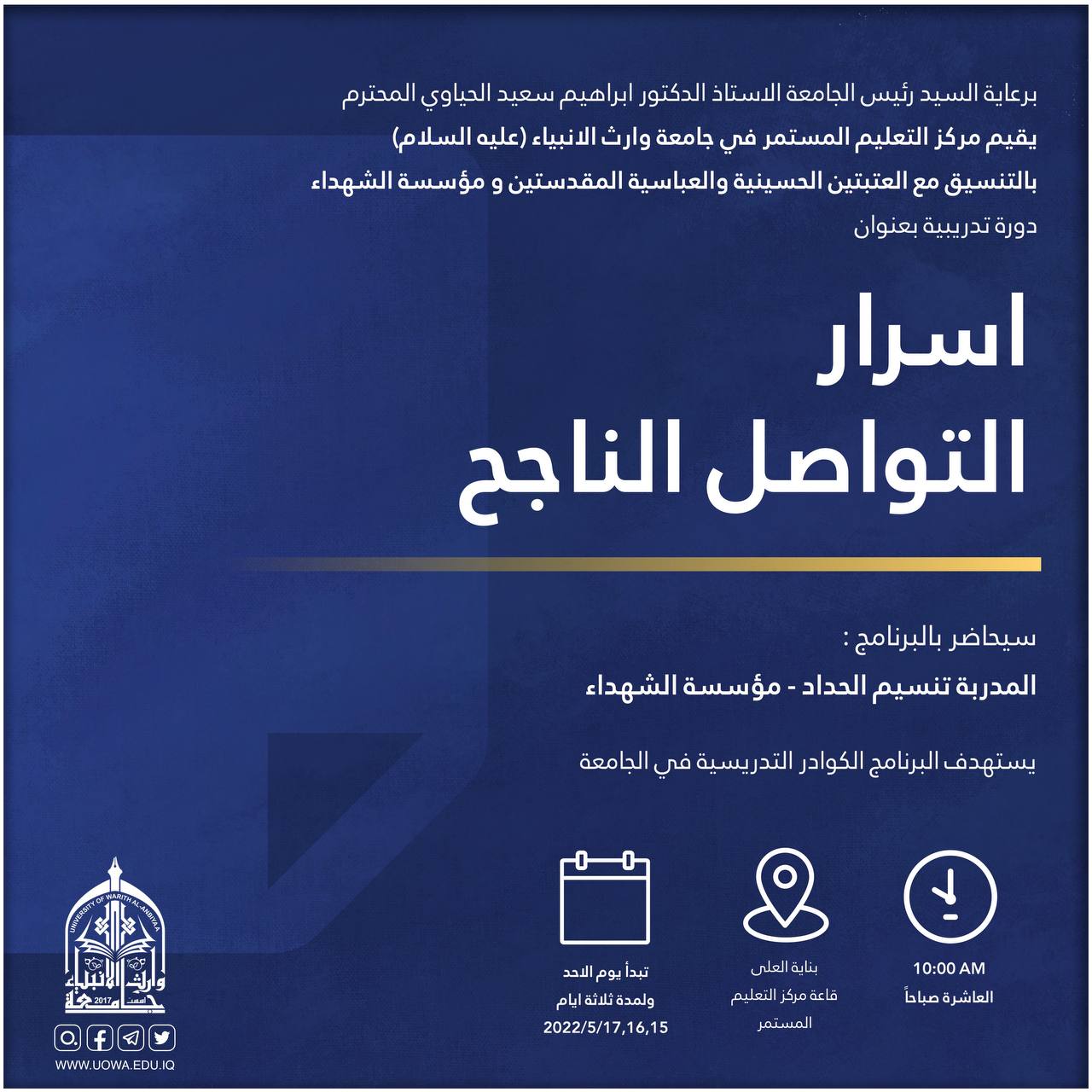 برعاية رئيس جامعة وارث الأنبياء (عليه السلام) الأستاذ الدكتور إبراهيم الحياوي يقيم مركز التعليم المستمر وبالتعاون مع العتبتين المقدستين ومؤسسة الشهداء/ كربلاء دورة تدريبية بعنوان "مهارات العرض والالقاء"