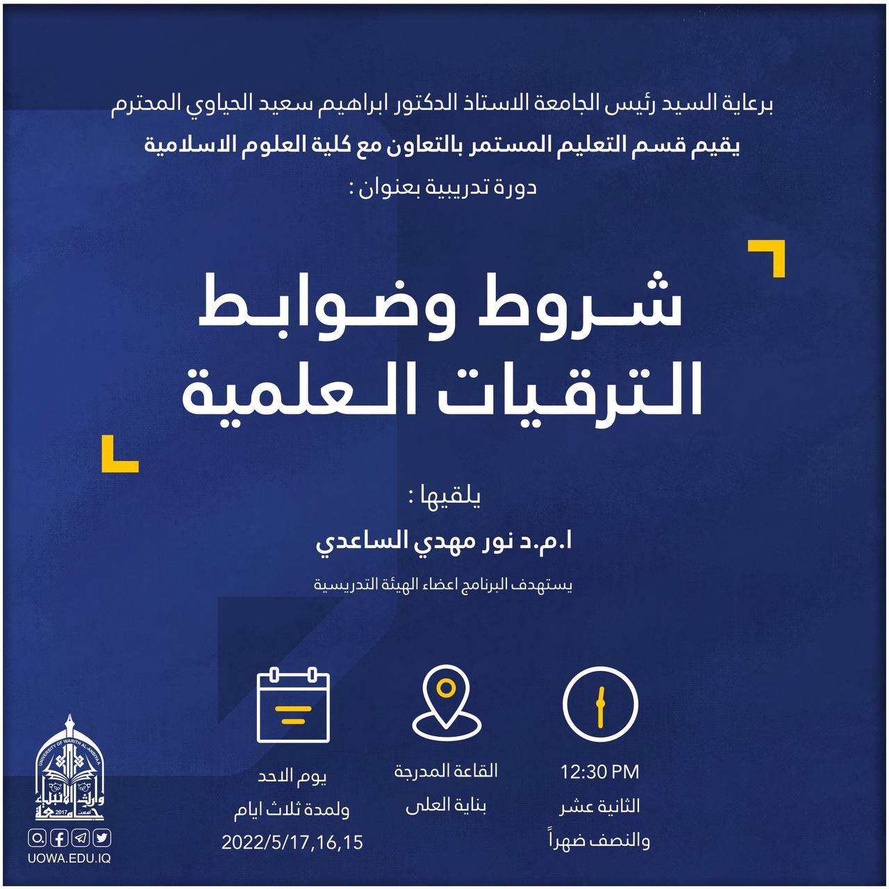 برعاية رئيس الجامعة الاستاذ الدكتور ابراهيم سعيد الحياوي يقيم قسم التعليم المستمر وبالتعاون مع كلية العلوم الاسلامية في الجامعة دورة تدريبية بعنوان "شروط وضوابط الترقيات العلمية"