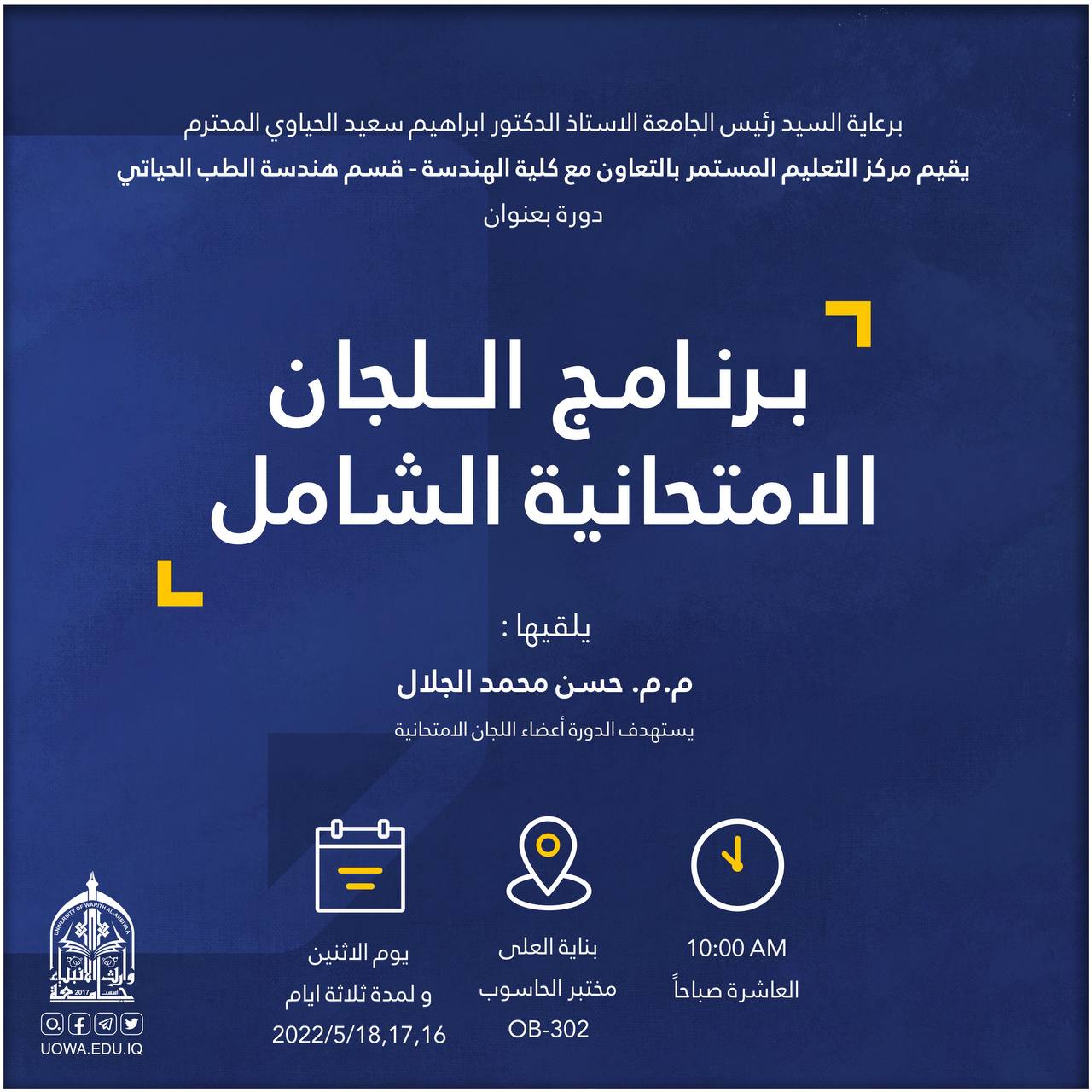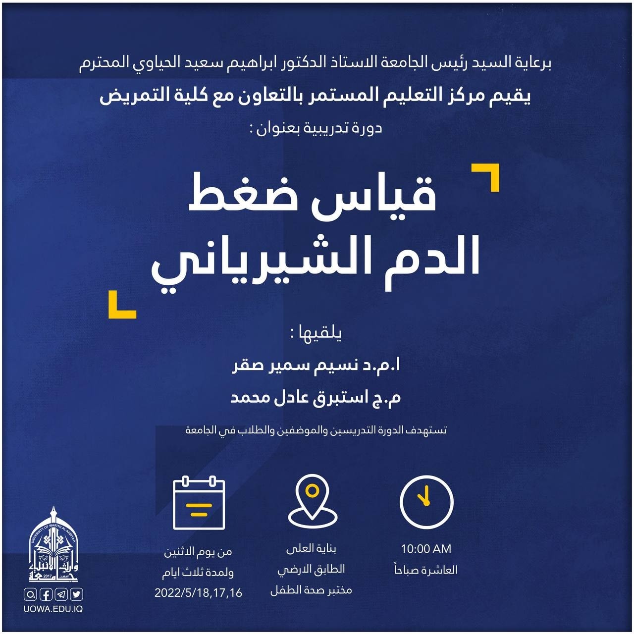 تستمر الدورة لمدة ثلاثة أيام ابتداءً من الاحد (15-16-17 /5/ 2022) على القاعة المدرجة في بناية العلا