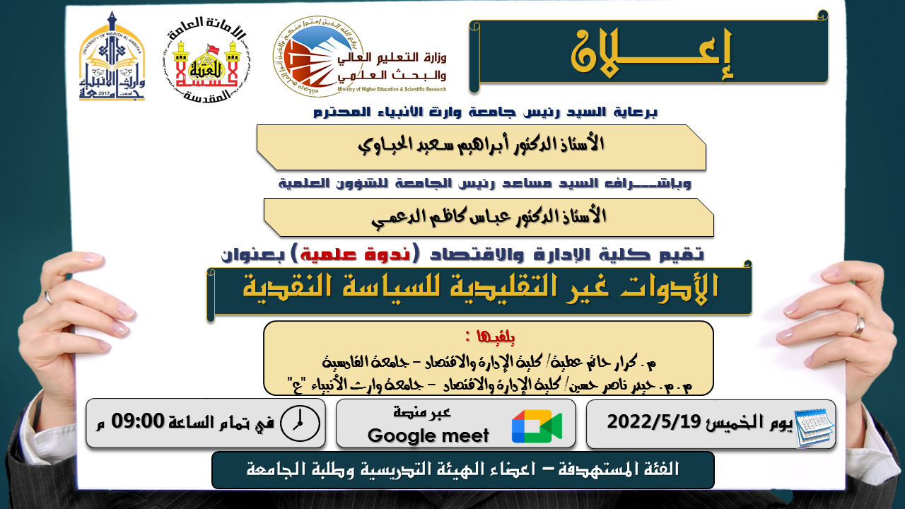 يقيم مركز التعليم المستمر في جامعة وارث الانبياء (عليه السلام) بالتعاون مع كلية الادار ة والاقتصاد ندوة علمية بعنوان " الأدوات غير التقليدية للسياسة النقدية"، يلقيها ... م. كرار حاتم عطية/ كلية الإدارة والاقتصاد - جامعة القادسية ، و م.م حيدر ناصر حسين/ كلية الإدارة والاقتصاد - جامعة وارث الأنبياء "عليه السلام".وذلك في يوم الخميس 2022/5/19 ، في تمام الساعة الـ 9:00 مساءً ، علماً ان الندوة تستهدف الهيئة التدريسية وطلبة كلية الادارة والاقتصاد عبر منصة Google meet و وذلك عبر الرابط الاتي https://meet.google.com/vsj-odyb-jpc
