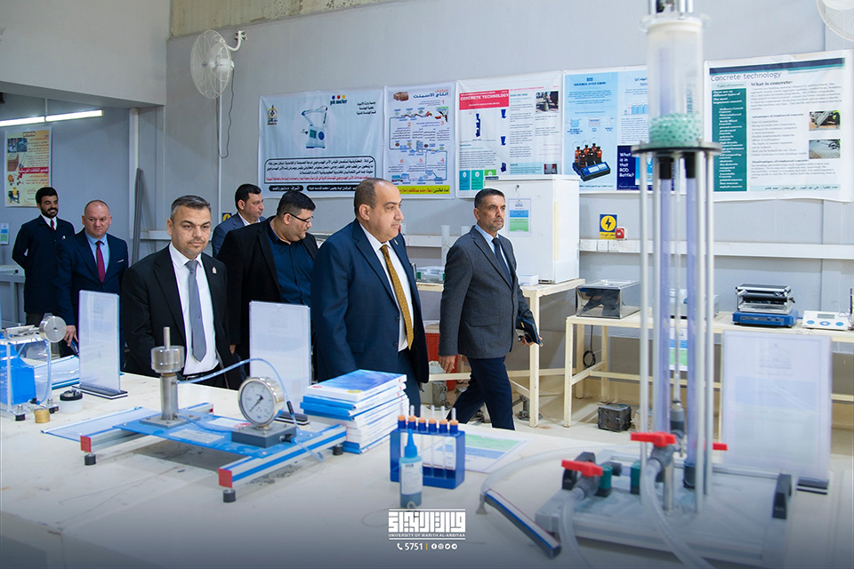 Professor Ibrahim Al-Hayawi, President of the University of Warith Al-Anbiyaa (peace be upon him), conducted a field inspection tour with Professor Waqad Al-Mousawi, Assistant Scientific, and Professor Hussein Hadi Al-Awadi, Dean of the College of Engineering. The aim of the tour was to assess the needs of engineering workshops and equipment. Various workshops and engineering facilities at the college were explored during the tour, evaluating the requirements for laboratory devices and engineering equipment necessary to enhance and improve the educational and research process at the college. This comes within the university's commitment to providing a distinguished educational environment and equipping engineering workshops with everything necessary to meet the needs of students and researchers, and to enhance progress and advancement in the fields of engineering and technology.