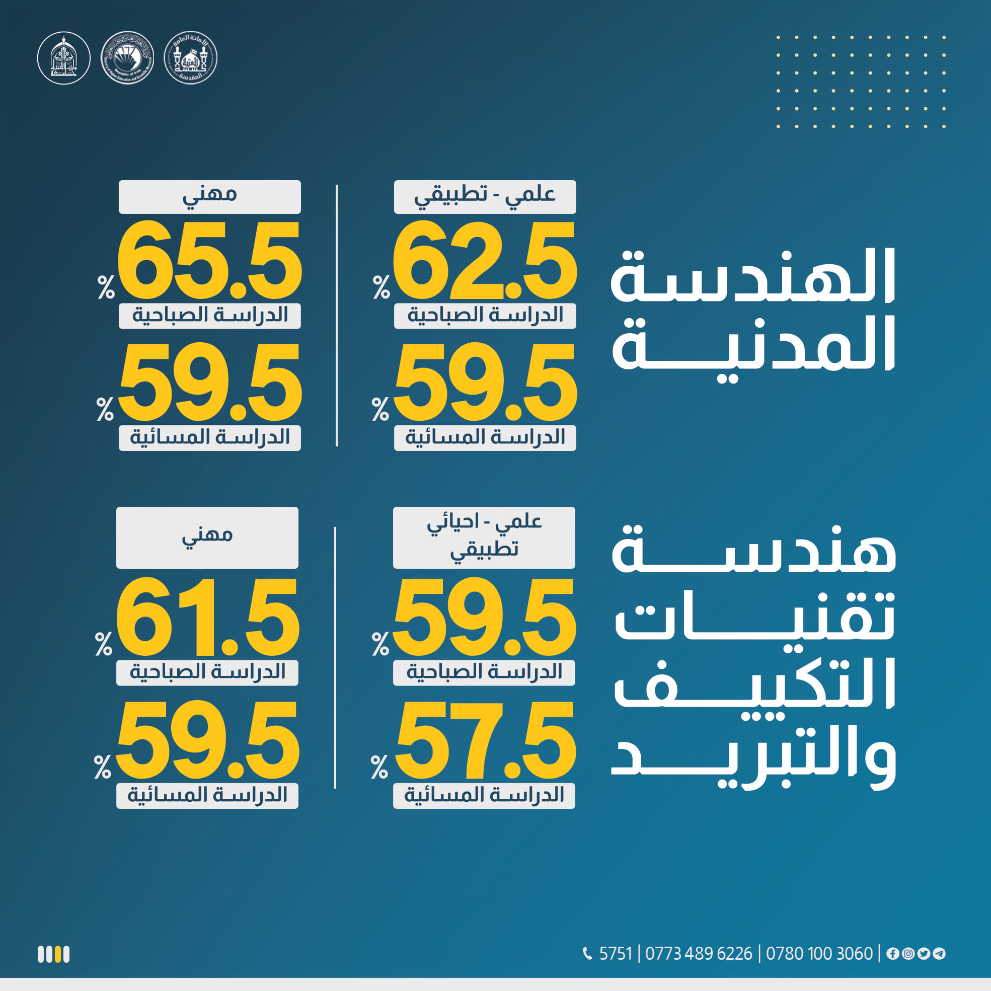 🔸 The minimum admission requirements for both morning and evening sessions for specializations in engineering, engineering technologies, and sciences have been reduced to a current application average of 61, increasing by only one grade.